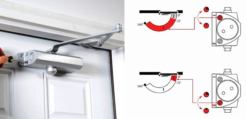 Per quanto riguarda la regolazione del chiudiporta, il dispositivo dispone di due viti per diverse fasi di chiusura. Con il loro aiuto, ha luogo la regolamentazione. Il primo campo di chiusura è il movimento principale della porta, il secondo è la regolazione della porta in posizione di chiusura, partendo da un angolo di 15-20 gradi appena prima della chiusura (regolazione-sbattimento).