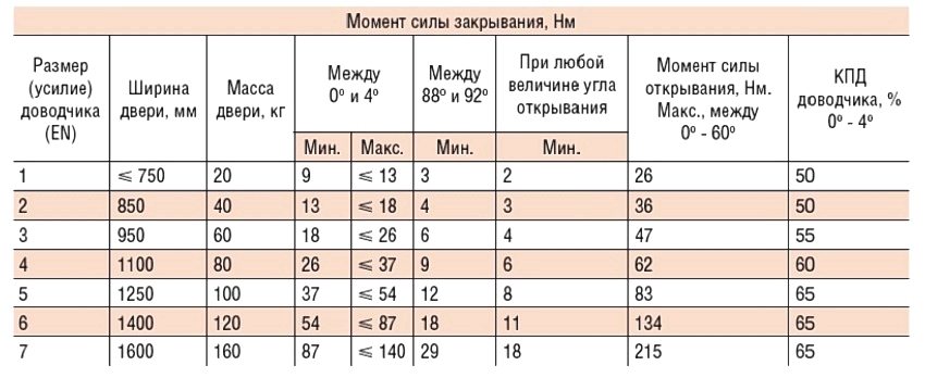 Consigli utili! Se la porta su cui è selezionato il chiudiporta ha dimensioni non standard con un'altezza superiore a 2,5 m, si consiglia di scegliere un modello di dispositivo di classe superiore, che garantisca un margine di sicurezza.