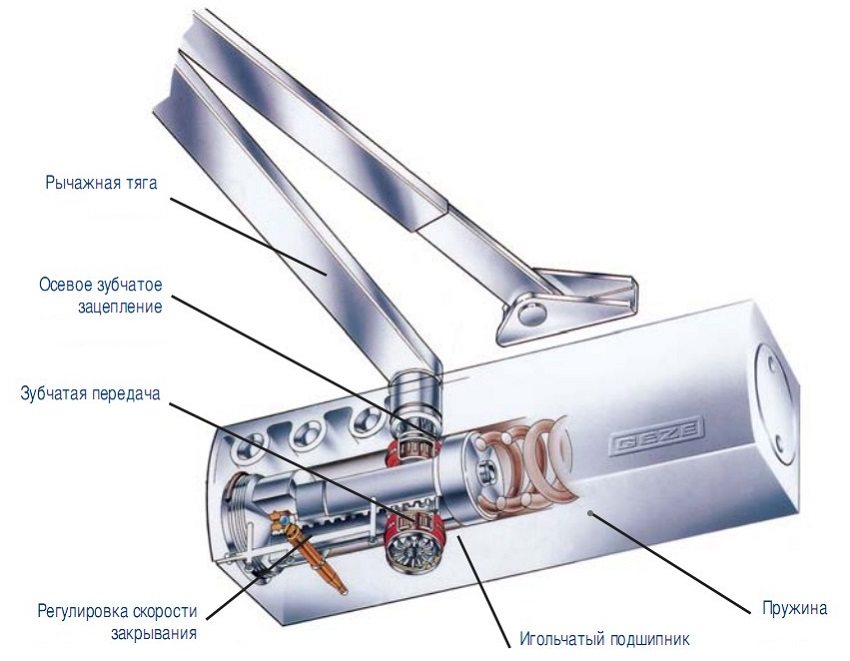 Il dispositivo chiudiporta comprende un braccio di collegamento e il corpo stesso con un meccanismo che consente alla porta di assumere una posizione chiusa. Il meccanismo è costituito da una molla abbastanza potente, che viene compressa a causa della forza del pistone. La molla, solitamente in acciaio, è racchiusa in un'apposita capsula. La capsula contiene olio che, quando la molla torna nella sua posizione originale, si sposta attraverso i canali idraulici nel contenitore di lavoro. Questa tecnologia fornisce una chiusura morbida e morbida della porta.