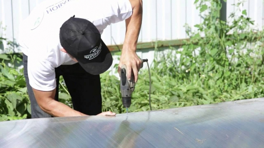 Dopo che il telaio è completamente pronto, non resta che tagliare e fissare il policarbonato. Per fare ciò, rimuovere la pellicola di imballaggio da esso e attaccare ciascuno dei fogli su un lato della serra. Il materiale viene fissato con viti per tetti, dopodiché viene tagliato alla dimensione desiderata.