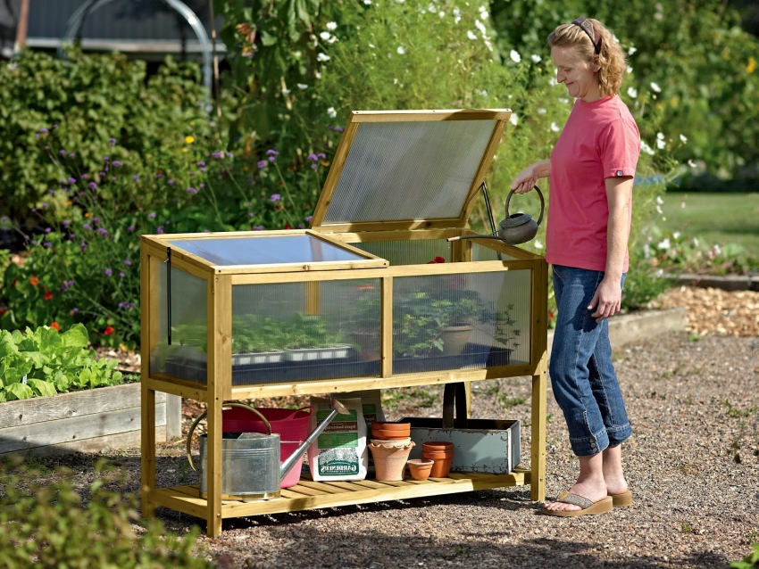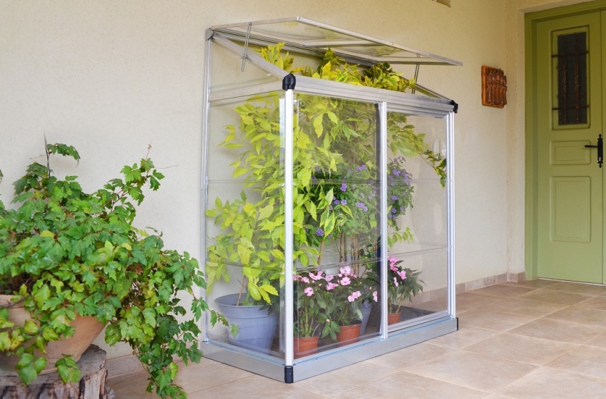 Una serra compatta e apribile per piantine con uno scaffale per forniture da giardino e fertilizzanti può essere costruita in modo indipendente senza grandi investimenti finanziari