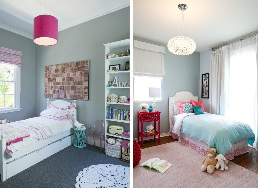 במבט ראשון נראה כי אפור אינו מתאים לעיצוב חדרה של ילדה, אולם ניתן לשלב גוון ניטרלי זה באופן מושלם עם כל האחרים. בשילוב עם לבן, הוא מסוגל להרחיב חזותית את החלל, עם בז 'או שמנת - ליצור אווירה רגועה ומרגיעה. צבע אפור נבחר לעתים קרובות לעיצוב חדר הילדים על ידי נערות מתבגרות.