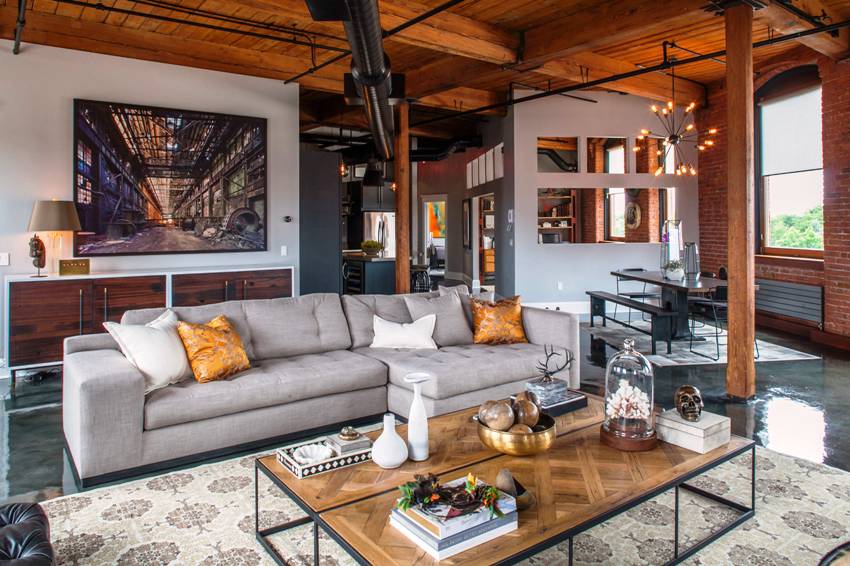 סגנון לופט אינו תמיד כיוון חד משמעי: בחדרים שונים שבהם הפנים עשוי, הסדר עשוי להיות שונה מעט. לדוגמא, סלון בסגנון לופט נחשב למקום המרכזי בדירה, ולכן מרוכז כאן המספר הגדול ביותר של אלמנטים דקורטיביים האופייניים לכיוון זה. שולחן קפה מזרן, שעל שולחןו מכוסה זכוכית עמידה, ייראה הרמוני. מעל השולחן מותקן נברשת. נדרש מתלה פתוח עם מדפים, בו יוצבו ספרים ואלמנטים דקורטיביים אחרים.