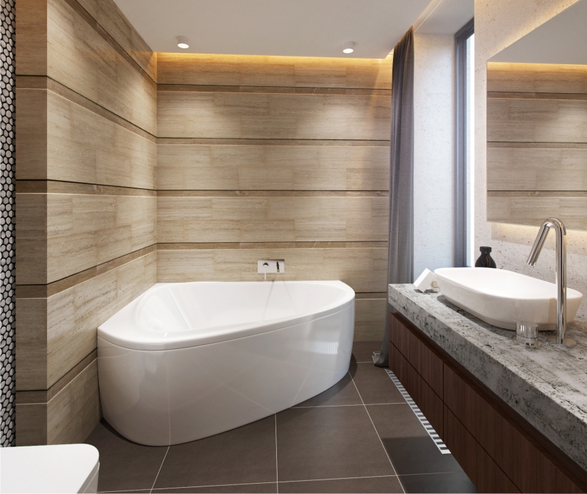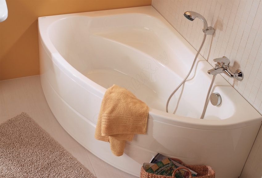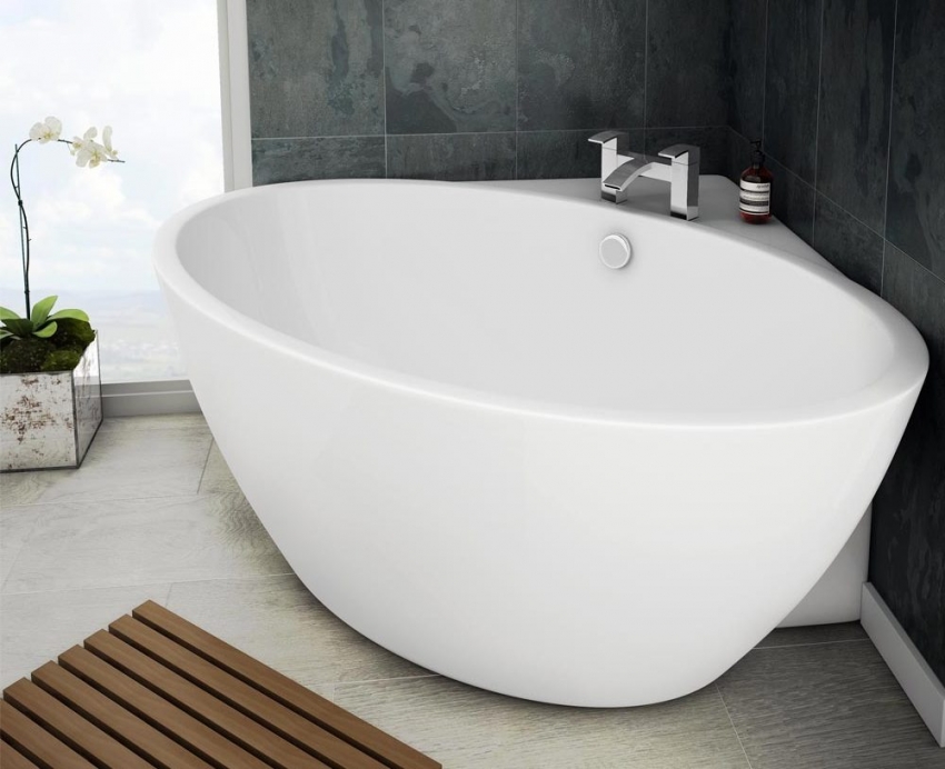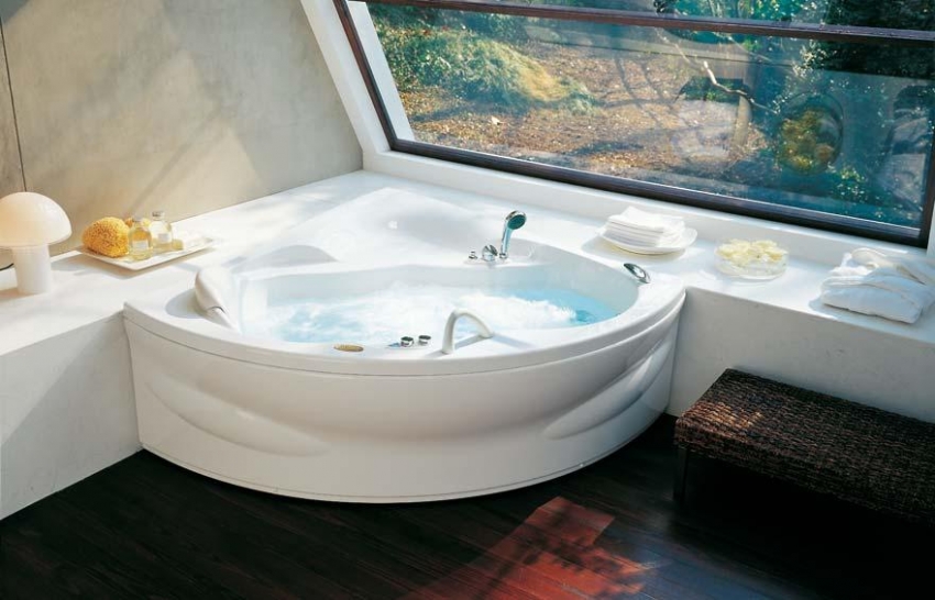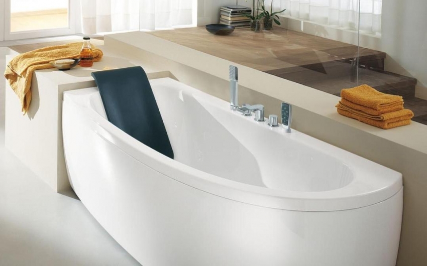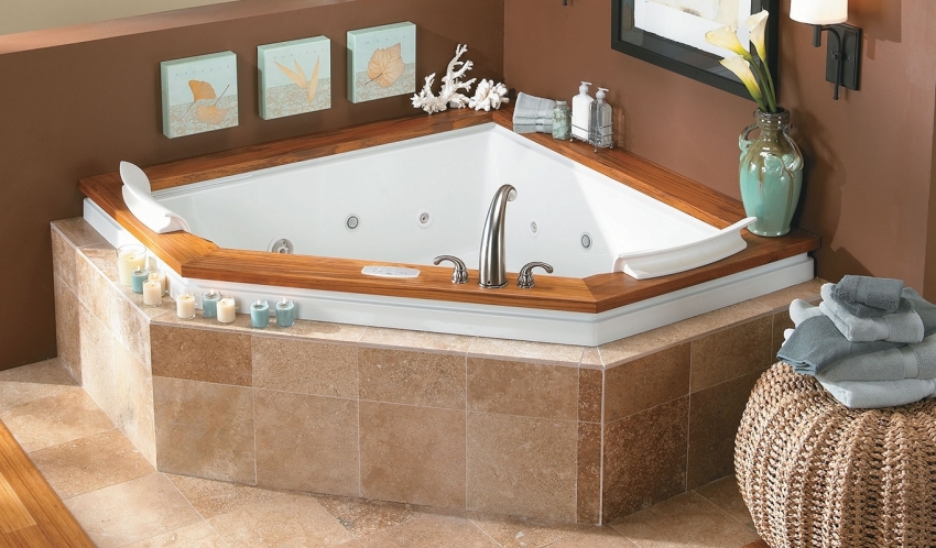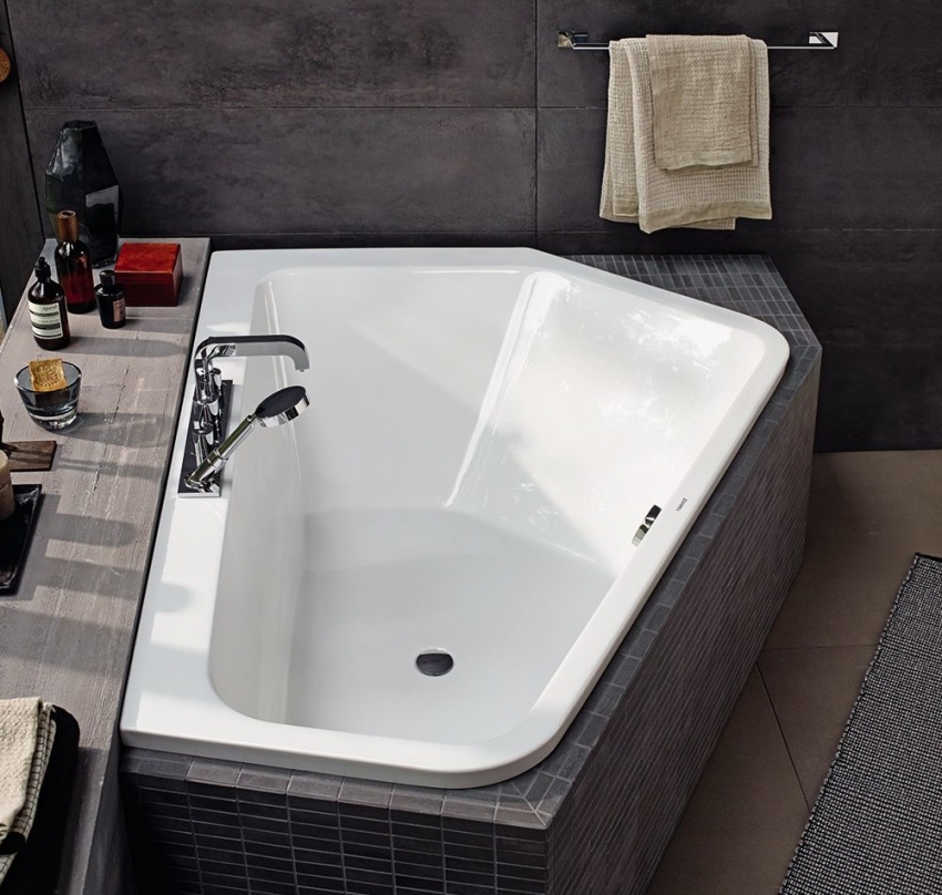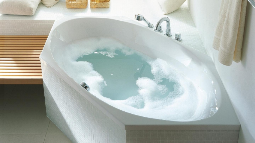 אמבטיה אקרילית פינתית יכולה להתאים באופן מושלם לכל חומר חיפוי בחדר האמבטיה