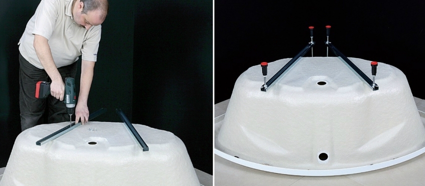 האמבטיה הפינתית, כמו אמבטיה רגילה, מותקנת על תומכים מיוחדים, אותם ניתן לספק בערכה