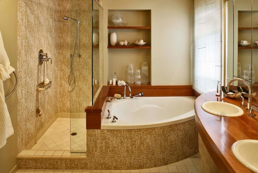 דוגמה לשילוב מוצלח של אמבטיה פינתית עם רהיטים