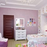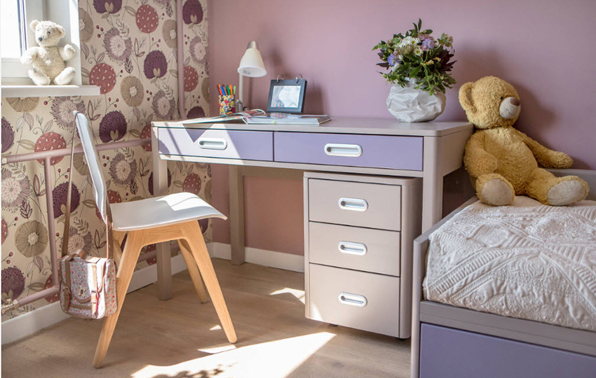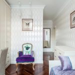 אם אתה משתמש בטפט לילך בשילוב עם גווני בז 'וחלב, אתה יכול לקבל פנים מאוזן רגשית. יתר על כן, גווני עזר אינם חייבים להיות נוכחים בעיטור עצמו. הם יכולים להיות חלק מטקסטיל או רהיטים. בזכות ניגוד זה תיווצר מצב רוח חיובי בחדר הילדים.