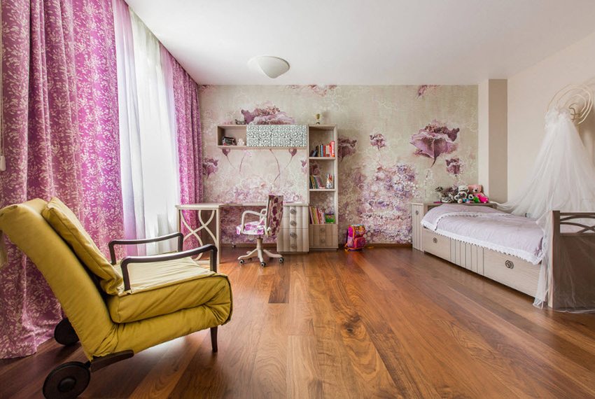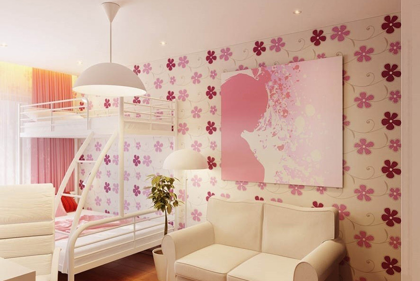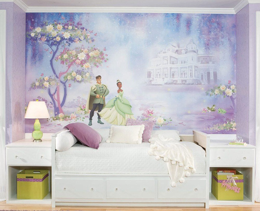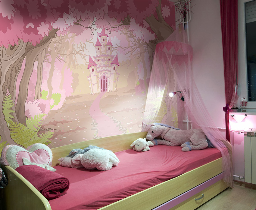 שימוש בטפט תמונות בחדר ילדים לילדה ייצור עיצוב מיוחד, ייחודי לחלוטין. הילד יכול לבחור באופן עצמאי תמונה, אשר לאחר מכן מוחלת על הבד באמצעות הדפסת הייטק. זהו היתרון בגימור זה.