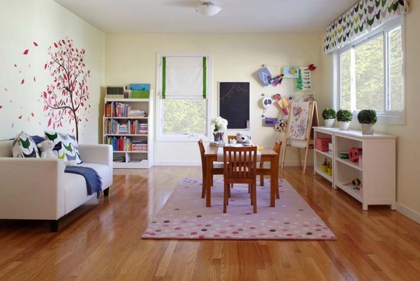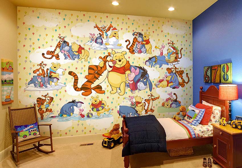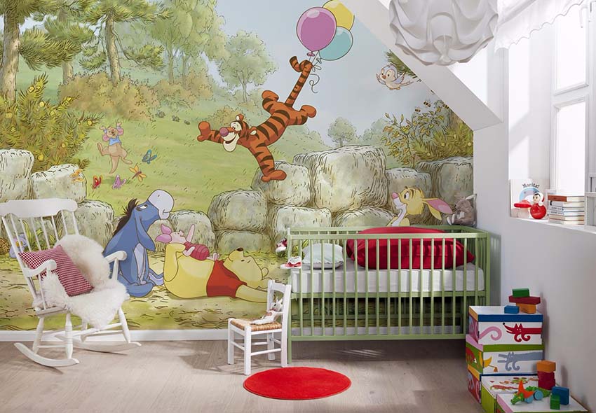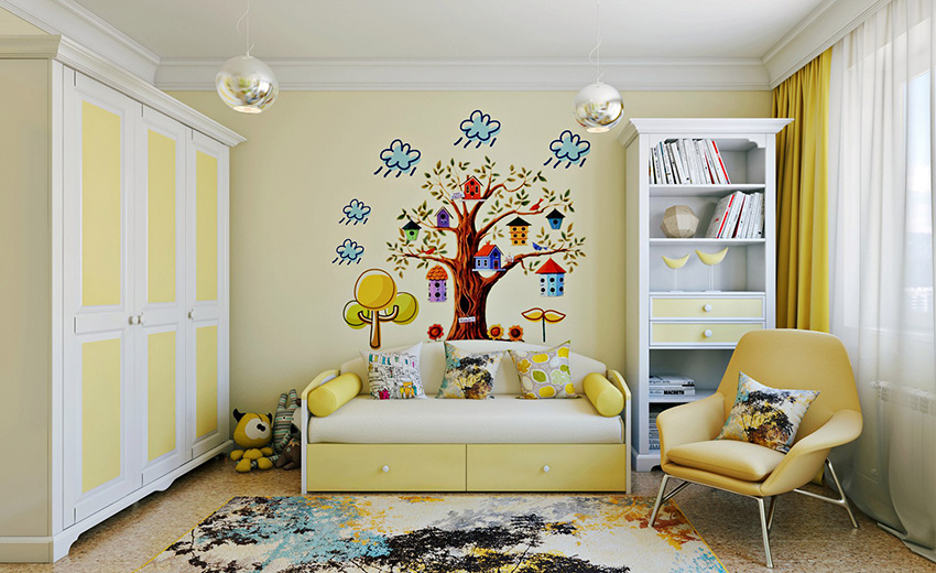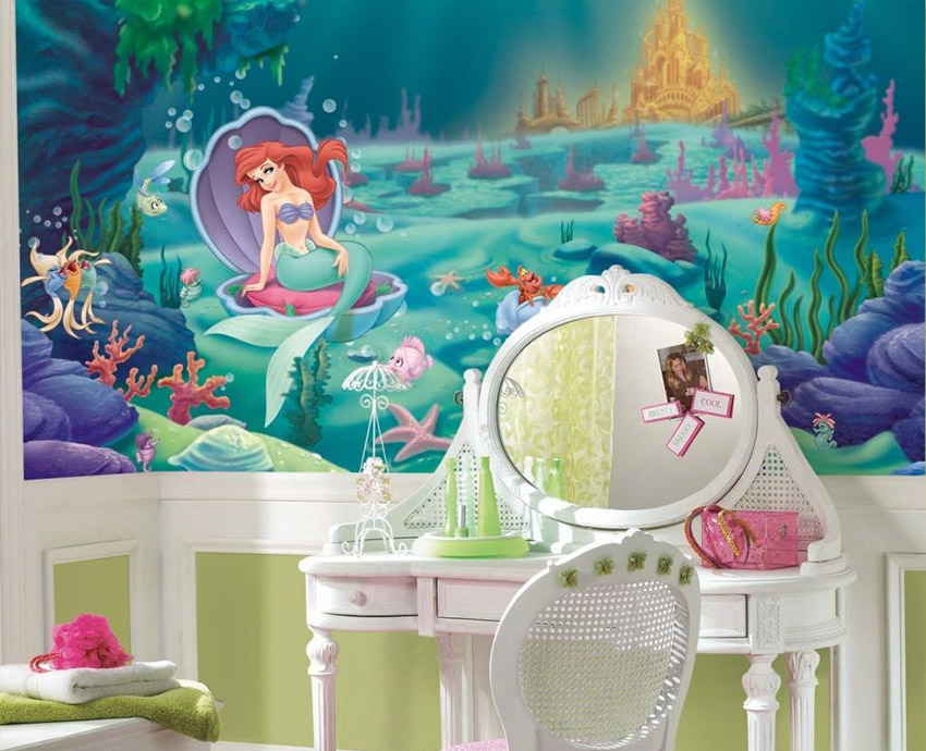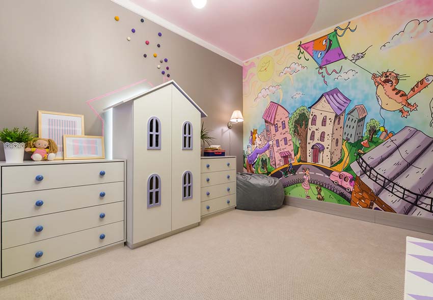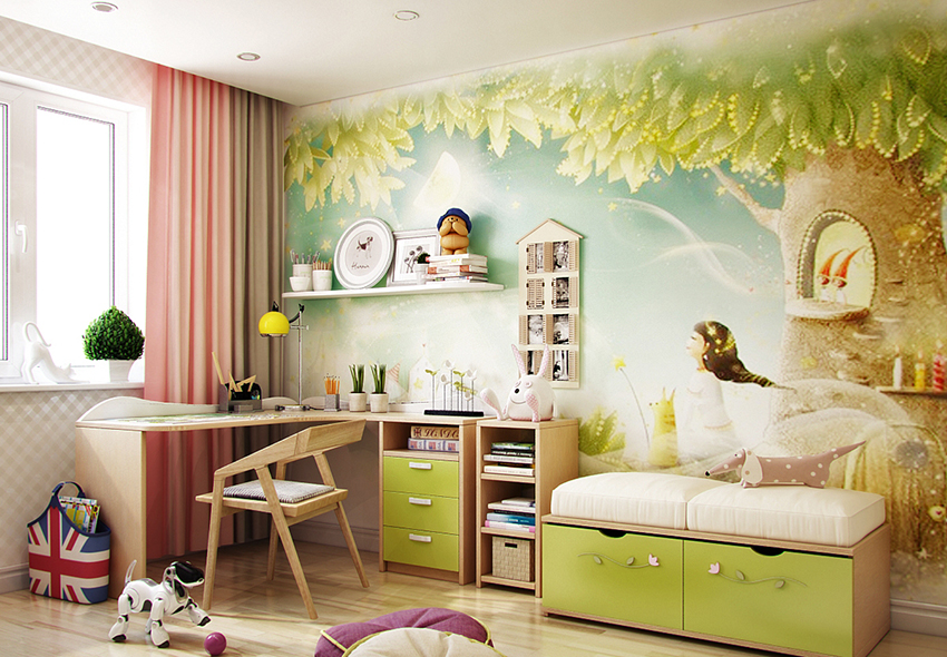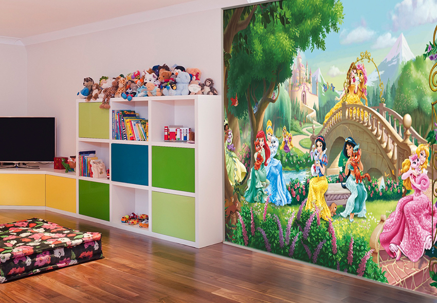 ציורי קיר משמשים באופן מקומי בפנים. הם משולבים בגימורים עיצוביים מרוסנים, מה שהופך את התמונה לבולטת מהרקע הכללי של החדר. לרוב, אזור המשחק מעוטר בטפט תמונות. אם חדר הילדים משתייך לילדה קטנה, תוכלו לבחור תמונות עם אגדות, למשל, דמויות מסרטים מצוירים של דיסני, בובות ברבי, נסיכות וכו '.