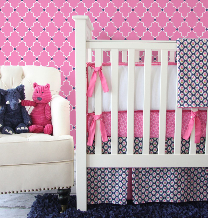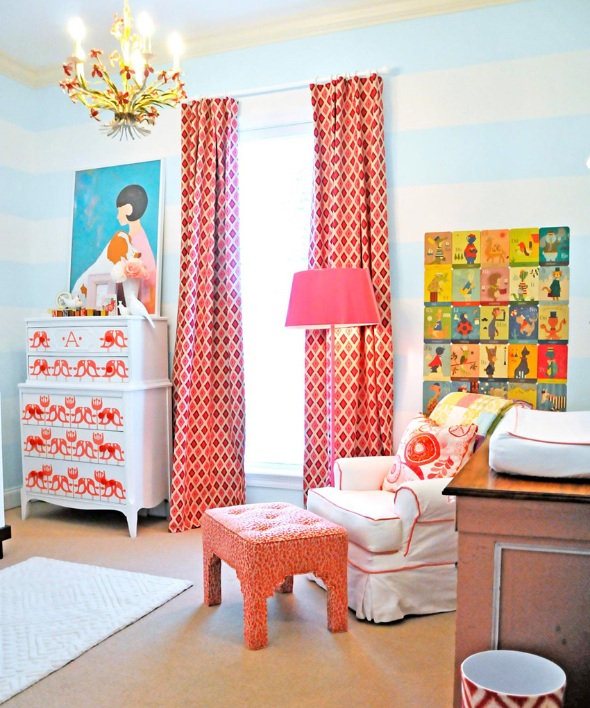 עיצוב גיאומטרי מתאים לבנות בגיל העמידה. פסים ומשבצות הם יוצאים מן הכלל. דפוסים אלה יכולים לשמש קישוט רבגוני לילדים בכל הגילאים. תלתלים ומונוגרמות מתאימים לסגנונות מסוימים כמו קלאסי, פרובאנס או אנגלית.
