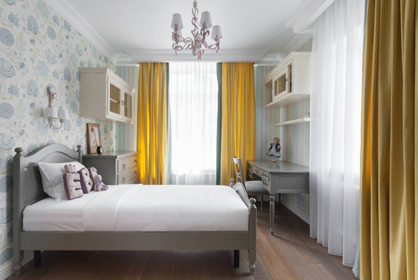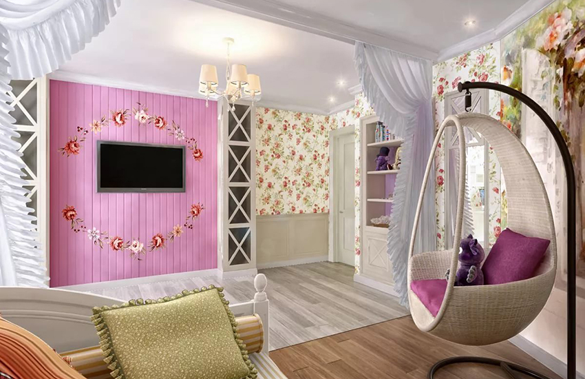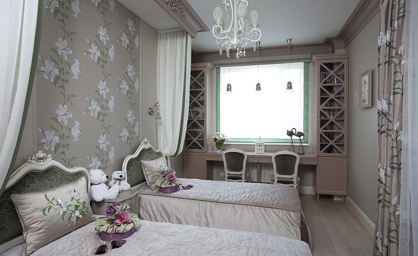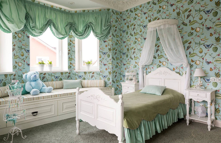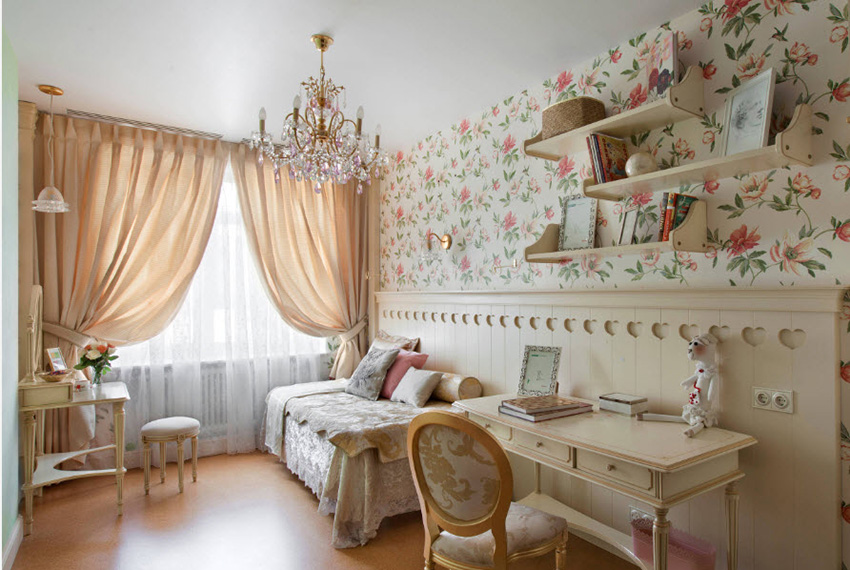 ליצירת פנים בסגנון פרובנס מתאימים טפטים חמודים לילדות עם מוטיבים פרחוניים, סלסולים וסלסולים, ריהוט קל וטקסטיל.