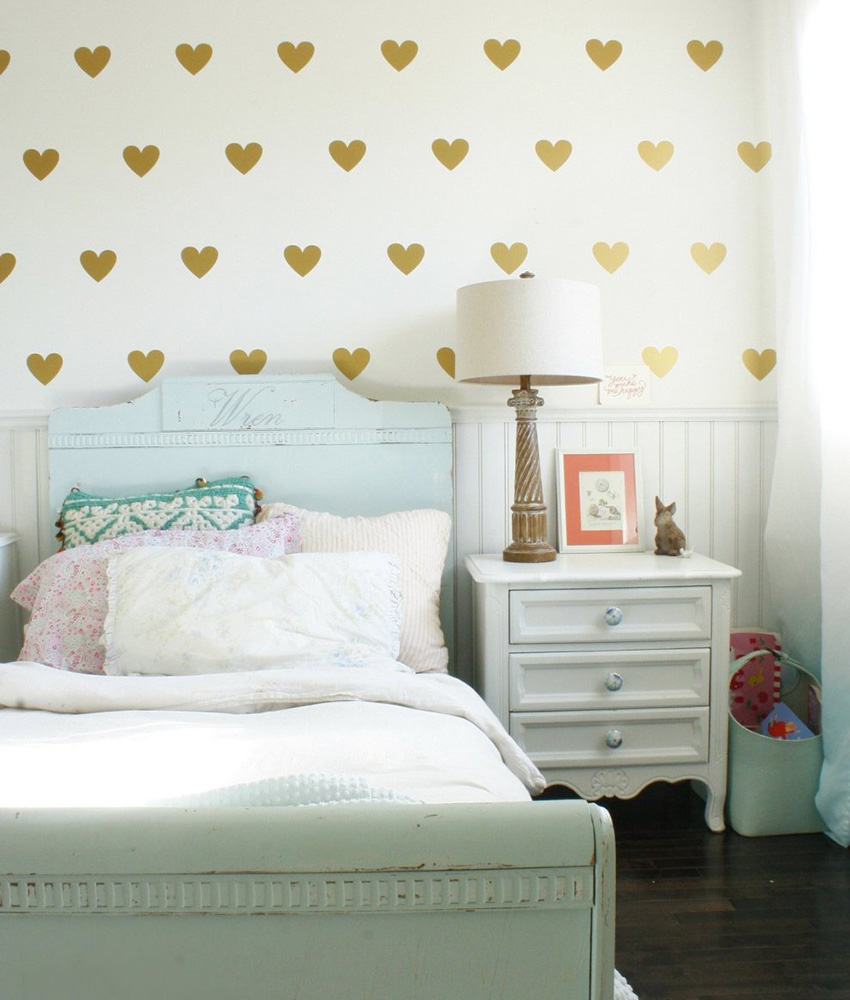 טפט מעוטר בלבבות יאהב את הנשים הקטנות. ילדות רבות אוהבות את הציור הזה, אך השתמשו בו בזהירות. לבבות הופכים במהירות משעממים ומשעממים, ולכן מומלץ להשתמש בהם באופן מקומי. במקרה זה, רוב הקירות צריכים להיות מעוטרים בטפט מונוכרומטי ניטראלי.