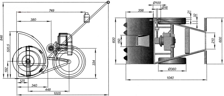 יש לחבר מנוע למסגרת שמספר הסיבובים אינו עולה על 1.5 אלף לדקה, וההספק הוא 5-6 קילוואט. כדי להניע את המנגנון דרך תיבת הילוכים, הדרך הקלה ביותר היא להשתמש בכונן שרשרת ובגלגלי שיניים מאופניים. באשר לנקב, הוא מותקן על צינור מתכת, אשר, בתורו, מחובר לדפנות הצד של דלי השלג בצורה שתוכל להסתובב.
