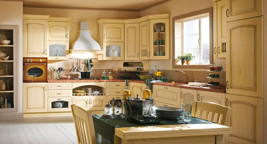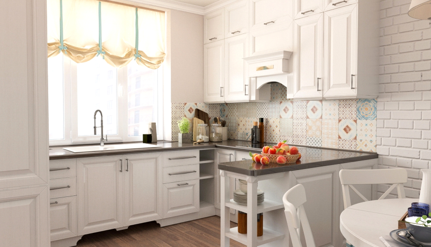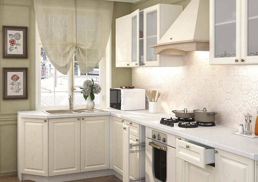 Si vous souhaitez organiser une direction classique, vous devriez regarder de plus près le style provençal, plus facile à organiser dans un espace exigu. Les couleurs blanches ou pastel iront bien dans une petite pièce. La décoration du style sera une cuisine d'angle sans armoires supérieures, au lieu de laquelle il y aura des étagères murales ouvertes fixes avec de beaux ensembles et des objets authentiques.