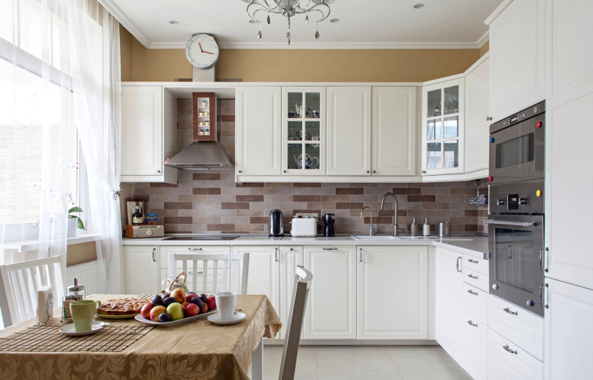 Conseil utile! S'il est décidé d'installer des meubles à angle droit, l'espace résultant sera pratique à utiliser pour placer les appareils ménagers, qui sont le plus souvent utilisés.