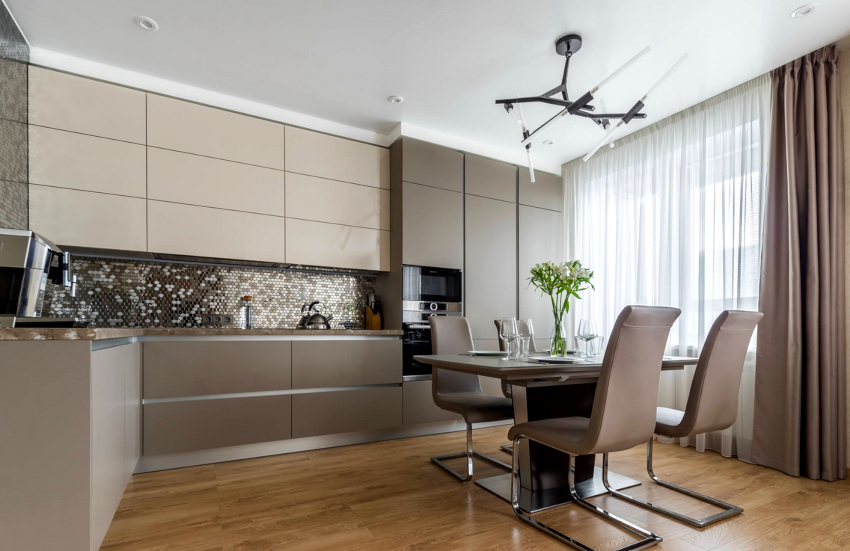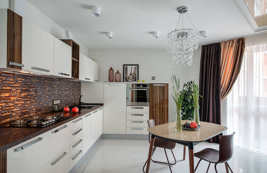 Il est recommandé d'effectuer le zonage en utilisant différentes options d'organisation de l'éclairage. Par exemple, un grand lustre est placé au-dessus de la table à manger, et le plateau est éclairé au moyen de spots encastrés dans le plafond, ou d'une bande de diodes fixée sous les armoires supérieures.