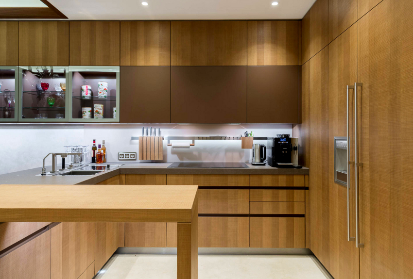 Cette conception de l'espace cuisine a ses inconvénients. Étant donné que la profondeur du comptoir est assez grande, il ne sera pas facile de nettoyer les murs du fond et le dosseret de la cuisine, et si la personne est petite, vous devrez même utiliser un petit tabouret. Par conséquent, lors de l'organisation d'une telle option de cuisine, vous devez vous assurer que la profondeur du module est optimale.