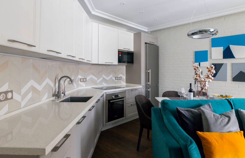 Une cuisine d'angle en forme de L est considérée comme une option polyvalente qui peut être utilisée dans des pièces de différentes tailles et formes. L'avantage de la disposition est l'utilisation maximale de l'espace en utilisant deux murs et un coin aveugle, grâce auquel vous pouvez augmenter la surface utilisable du comptoir. Le principal avantage de la disposition de la cuisine d'angle est l'organisation correcte du triangle de travail, composé d'un réfrigérateur, d'un évier et d'une cuisinière.