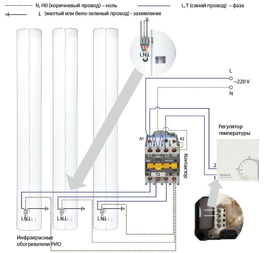 Prijungimo schema infraraudonųjų spindulių šildytuvai prie termostato
