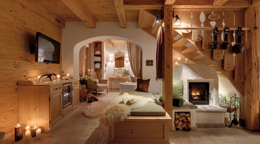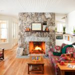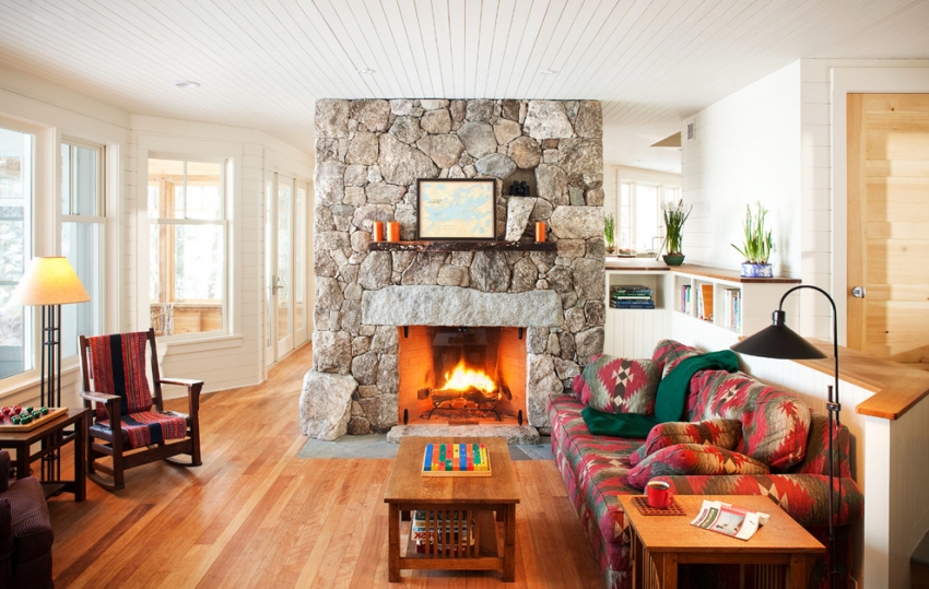 Lengviausias būdas palaikyti kambario dekoravimą namelio stilius židinio sąskaita - jį apdailinti natūraliu akmeniu ar jo imitacija. Patartina dizainą kuo labiau priartinti prie senojo židinio išvaizdos, tačiau tuo pat metu laikytis romantiškos nuotaikos.