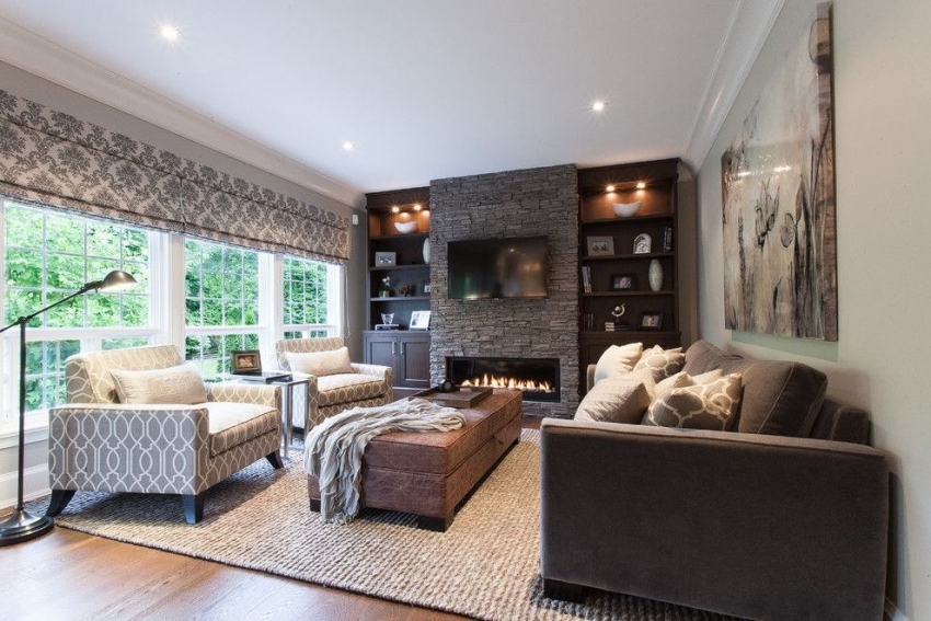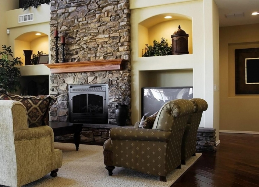 Neteisingų židinių dizainas svetainės interjere: kaimiško stiliaus kambarių nuotraukos