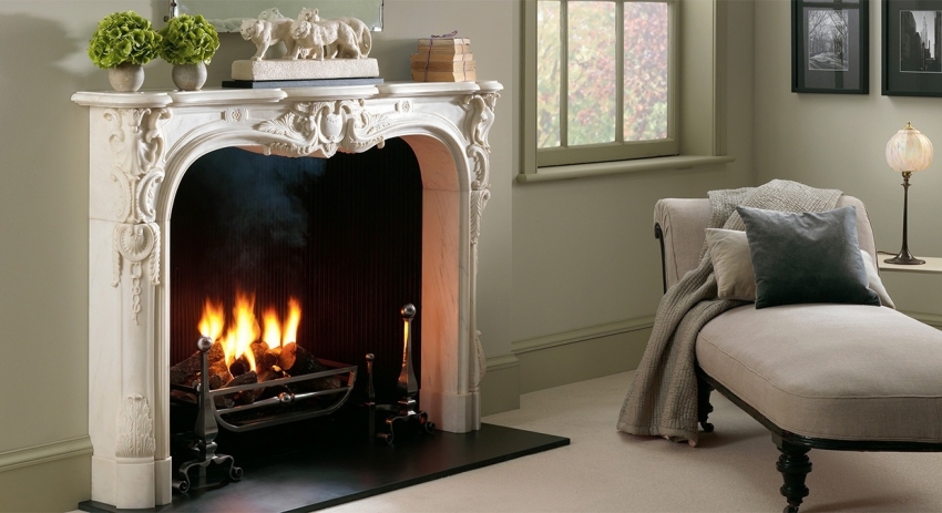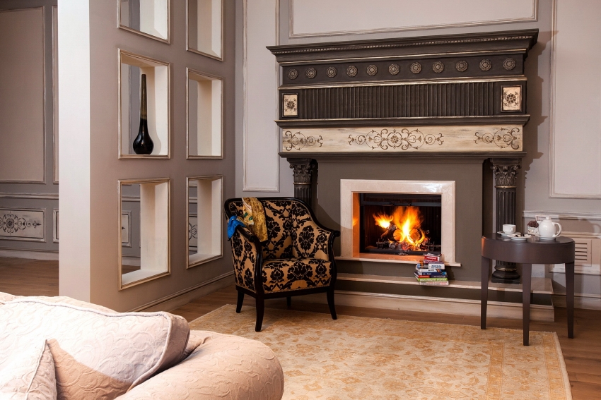 Norėdami papuošti židinį baroko stiliaus, galite naudoti iš tauriosios medienos pagamintą raižytą portalą