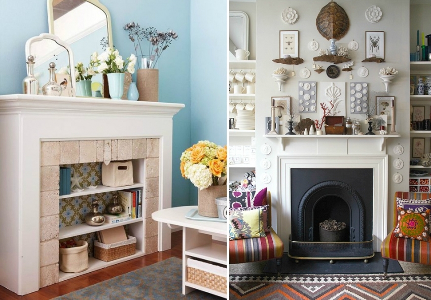 Naudingas patarimas! Jei buto dekoratyviniame židinyje nėra lentynos, stilizuotus dažytus indus galima įdėti į mažas spinteles su stiklinėmis durimis, dedant jas palei sienas.