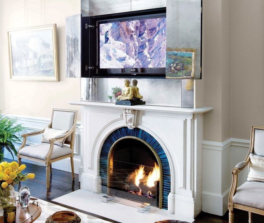 Jei svetainės interjere vietoj dekoratyvinės konstrukcijos yra sumontuotas elektrinis židinys, visa tai padės laikytis reikiamo stiliaus, nepaisant šiuolaikiško židinio dizaino. Tinkamo dizaino portalą galite nusipirkti paruoštą arba pagamintą patys.