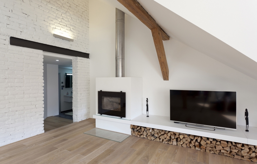Palėpės stilius yra lakoniškas, todėl jis pastatytas tam, kad atidžiau pažvelgtų į modernesnį elektrinio židinio dizainą