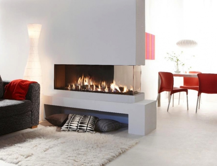 Kampinis židinys gali būti dedamas į specialią gipso kartono pertvarą, kuri leis jums pelningai zonuoti kambario erdvę