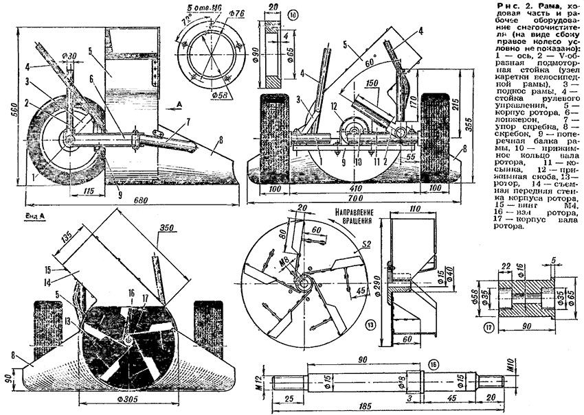 Naudingi patarimai! Savo rankomis surenkant namui nesavaeigę sniego valytuvą, turėtumėte naudoti kuo lengvesnes dalis, nes įranga veiks žmonių pastangomis.