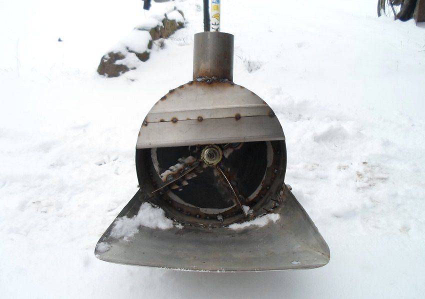 Tada eikite į sniego valymo įrenginį. Jis gali būti pagamintas iš 100 mm skersmens ir apie 1 m ilgio vamzdžio. Norint sumontuoti vamzdį, varžto korpuse padaroma atitinkamo skersmens skylė. Jis turėtų būti užpakalinėje korpuso dalyje. Į šią skylę įkišamas sniego valytuvo vamzdis, tvirtinamas varžtais, o viršuje - dėžutė.