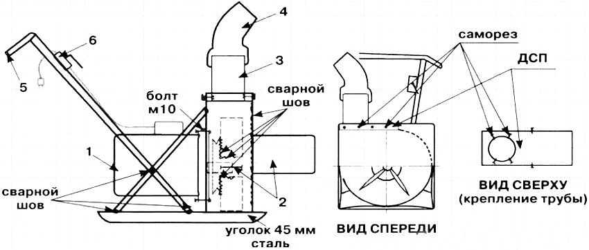 Elektrinio sniego pūtimo įrenginio pavyzdys: 1 - elektrinis variklis; 2 - skriemulys nuo automobilio; 3 - kanalizacijos plastikinis vamzdis; 4 - pusė bakstelėjimo; 5 - vairas; 6 - paketinis jungiklis