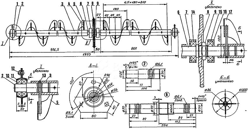 Sniego pūstuvo sraigto mechanizmas: 1, 11 - galinio guolio korpuso pusės (plienas, lakštas s2, 4 vnt.); 2 - galinė ašis (plienas, strypas d30, 2 vnt.); 3 - sraigtinis velenas (plienas, vamzdis 42x6,5, 2 vnt.); 4,13 - smeigės MB (plieninės, strypas d6, 36 vnt.); 5, 17 - varžtai (plienas, lakštas s2); 6 - centrinė ašis (plienas, strypas d40); 7, 16 - centriniai guolių korpusai; 8 - žvaigždutė (z = 36, t = 19,05); 9 - veržlė М36х3; 10 - guolis 160205 (4 vnt.); 12 - varžtas М8 (6 vnt.); 14, 15 - guoliai 236205