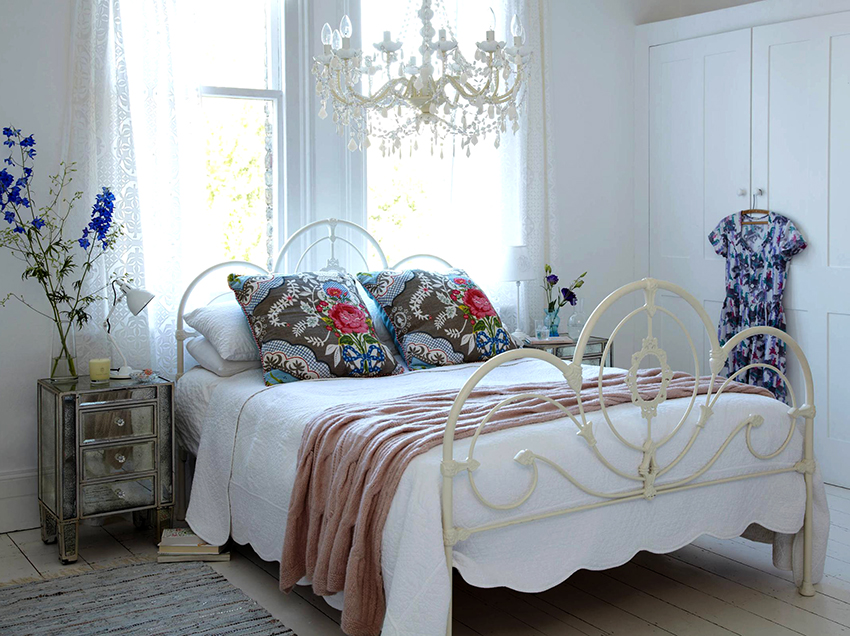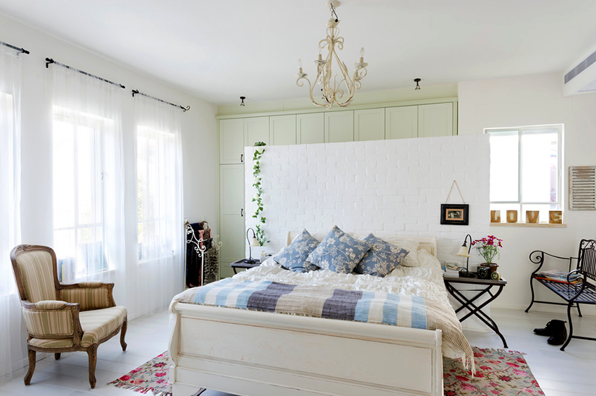 Labs risinājums būtu drapējums ap gultu, ko attēlo gaišs aizkars vai nojume. Šādus tekstilizstrādājumus var izmantot kā aizkarus. Gulta ir pārklāta ar skaistu gultas veļu baltā vai bēšā krāsā, gultas pārklāju maigās, gaišās krāsās, rotātu kokvilnas mežģīnēm. Dekoratīvie spilveni noplukušajā šiks stilā eleganti izskatīsies uz guļamgultas. Zem gultas var ievietot vecus nolietotus koferus, pītus grozus vai kastes ar ažūra apdari.