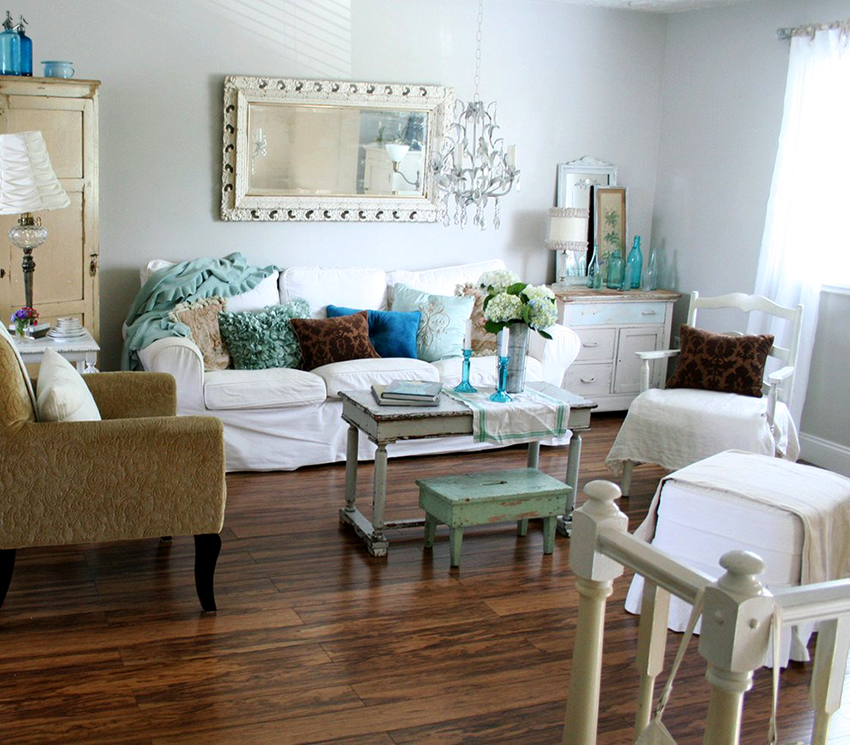 Dzīvojamā istaba noplukušā šika stilā: istabas interjera foto