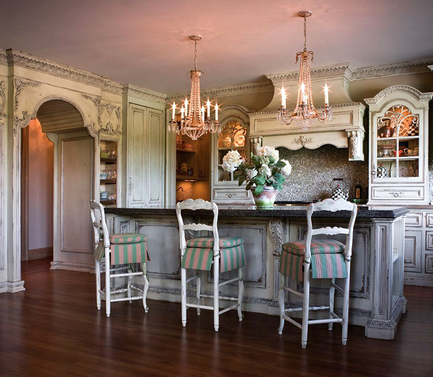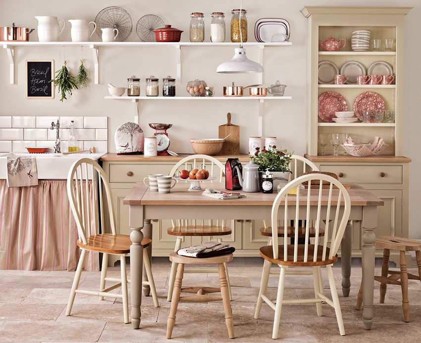 Virtuves interjers nobružātā šika stilā organiski derēs vecam bufetam vai bufete, kur atrodas skaists serviss, dārgi galda piederumi, vintage ēdieni, kas telpai piešķir īpašu atmosfēru. Atsevišķus elementus var izvietot uz sienām vai uz atvērtiem plauktiem.