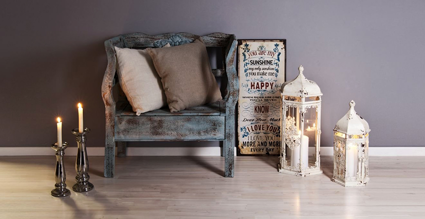 Dzīvojamās istabas dekorēšanai noplucinātā šika stilā varat izmantot antīkus svečturus un dabiskus ziedus