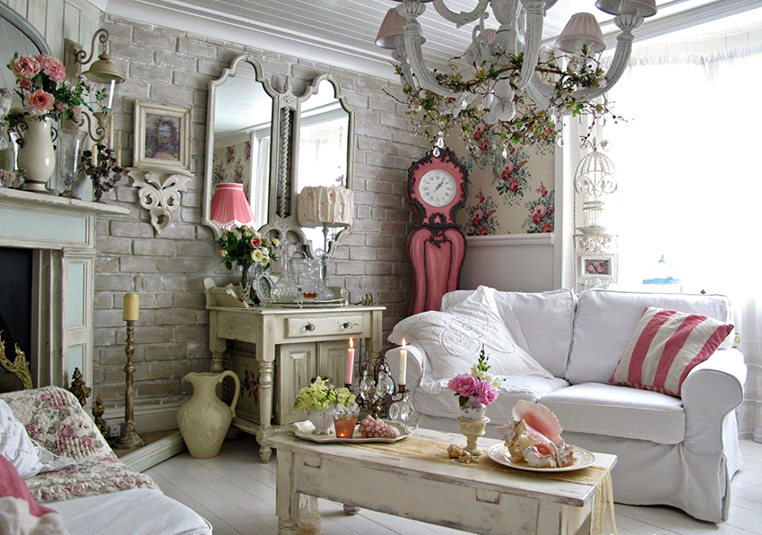 Grezna kristāla lustra rotā viesistabu noplucinātā šiks stilā. Blakus dīvānam vai atzveltnes krēsliem varat novietot grīdas lampa ar auduma nokrāsu, kas izgatavota atbilstoši polsterējumam. Sveces antīkos svečturos, kas izvietotas visā telpā, palīdzēs telpai pievienot siltumu un komfortu.