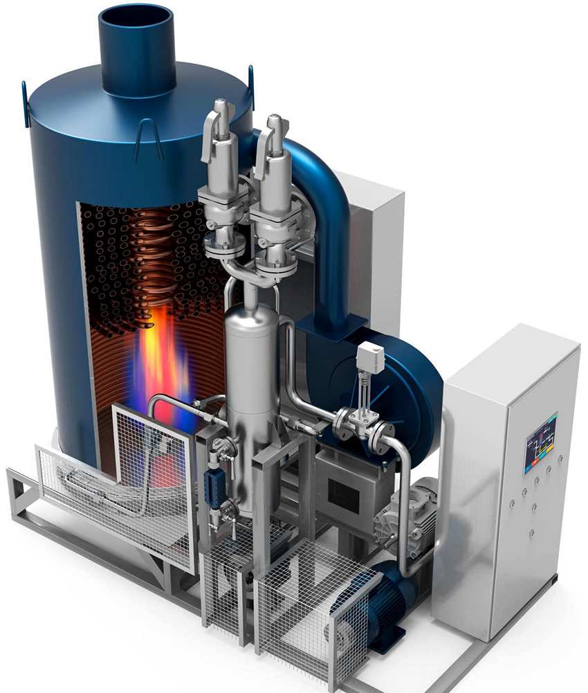 Penjana wap diesel. Dibolehkan menggunakan minyak diesel atau minyak sebagai bahan bakar. Kelebihan utama adalah kuasa tinggi. Di sini, pengukus adalah gegelung berterusan dalam bentuk tiub spiral. Gegelung bersebelahan dengan ruang pembakaran di mana elemen pemanasan berada. Oleh kerana autonomi dan saiznya yang padat, ia dapat dipasang di bilik dandang dengan kawasan yang kecil.