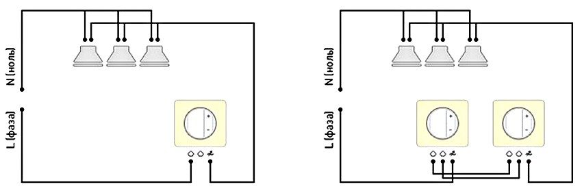 Proses menghubungkan dimmer dengan suis dilakukan secara berurutan. Beberapa dimmer dilengkapi dengan fungsi start / stop. Sekiranya anda membeli model seperti itu, maka apabila anda memasang dimmer, suisnya diganti sepenuhnya oleh peranti ini.