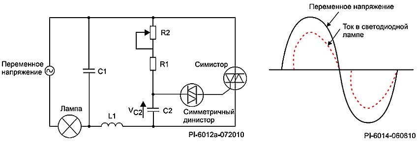 Kadar pengisian bergantung pada nilai potensiometer R, yang dikenakan pada permulaan gelombang separuh positif. Apabila penunjuk rintangan pada triac mencapai nilai minimumnya, lampu akan terbuka dan lampu menyala hingga akhir gelombang separuh. Gambar yang sama diperhatikan dalam hal gelombang separuh negatif, kerana arus di triac dipindahkan ke kedua arah.