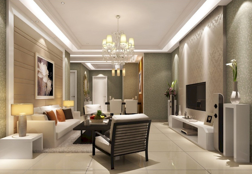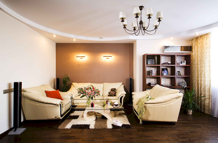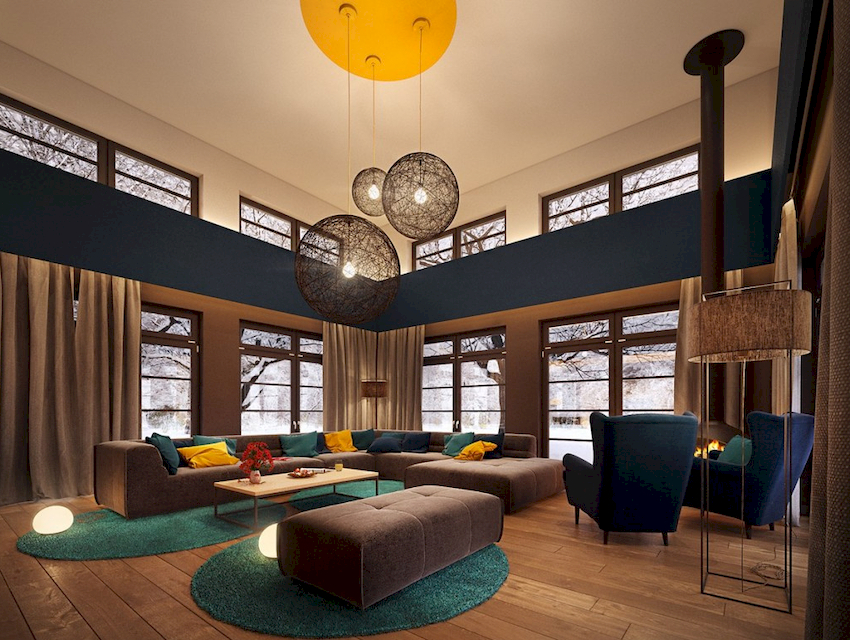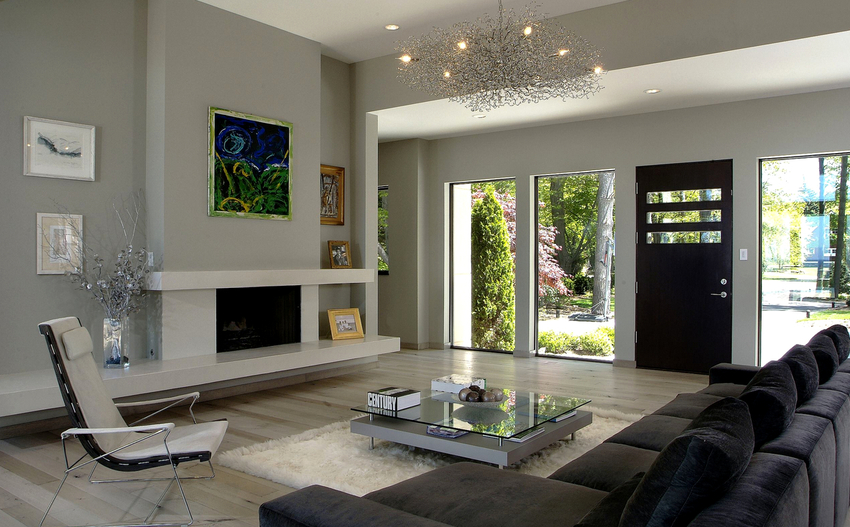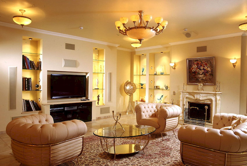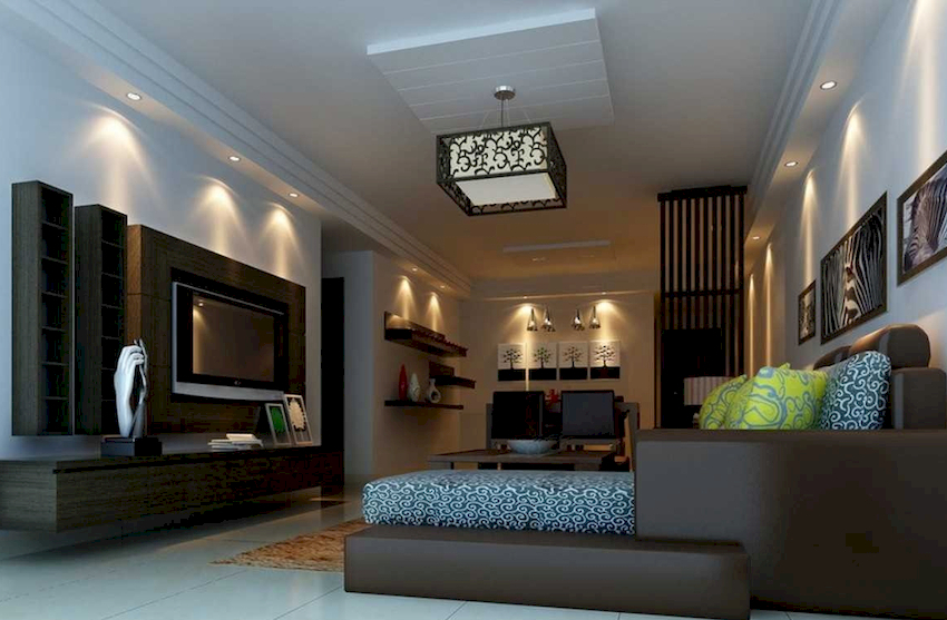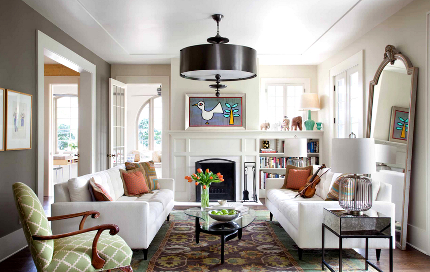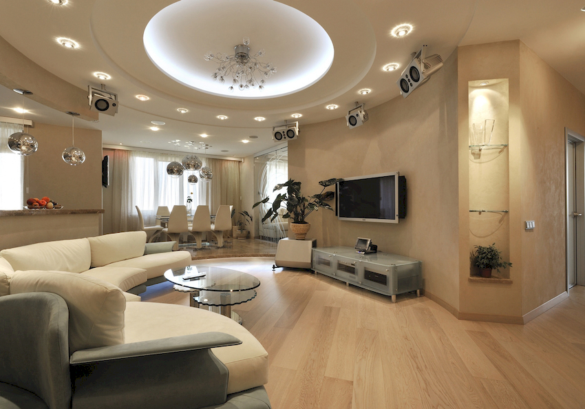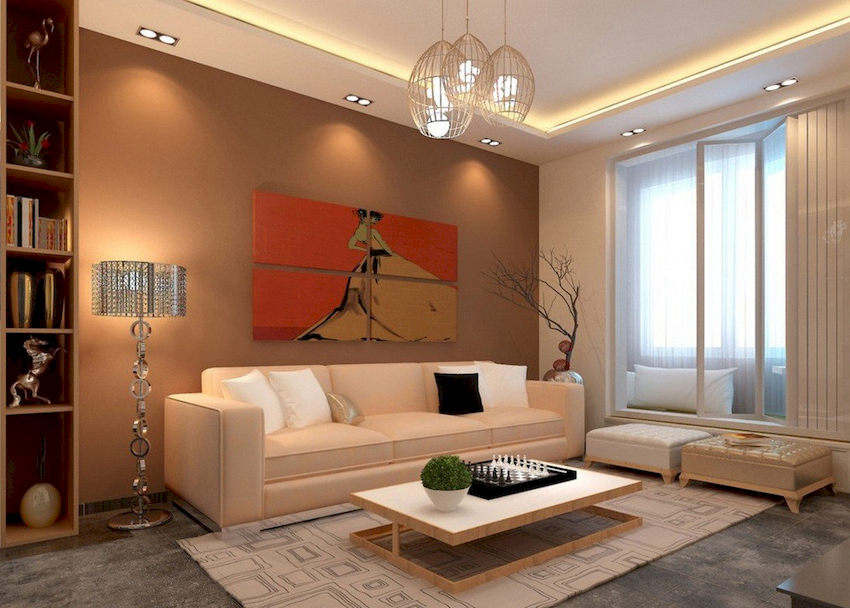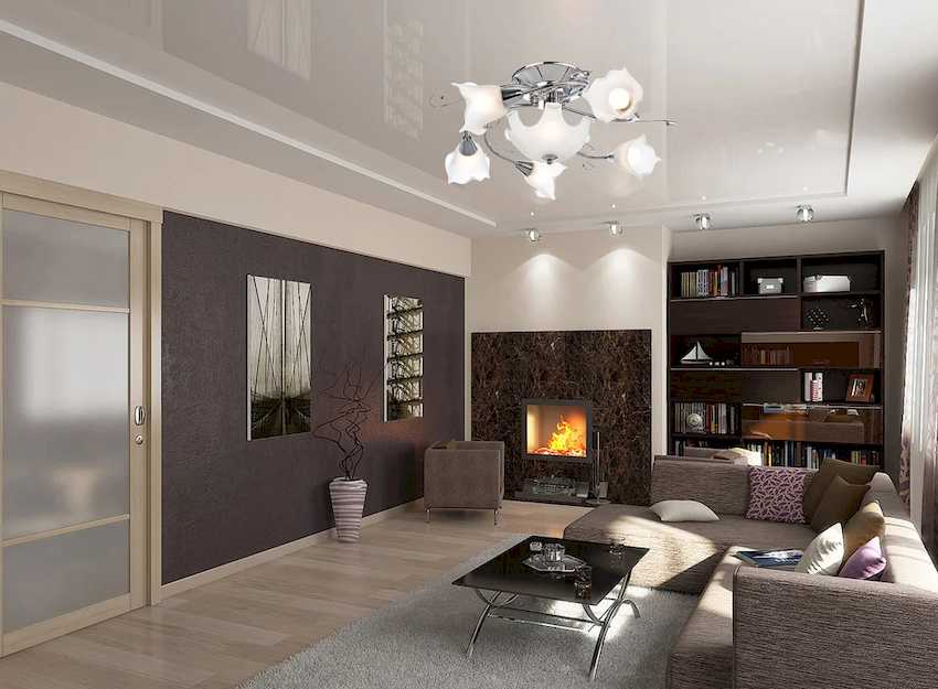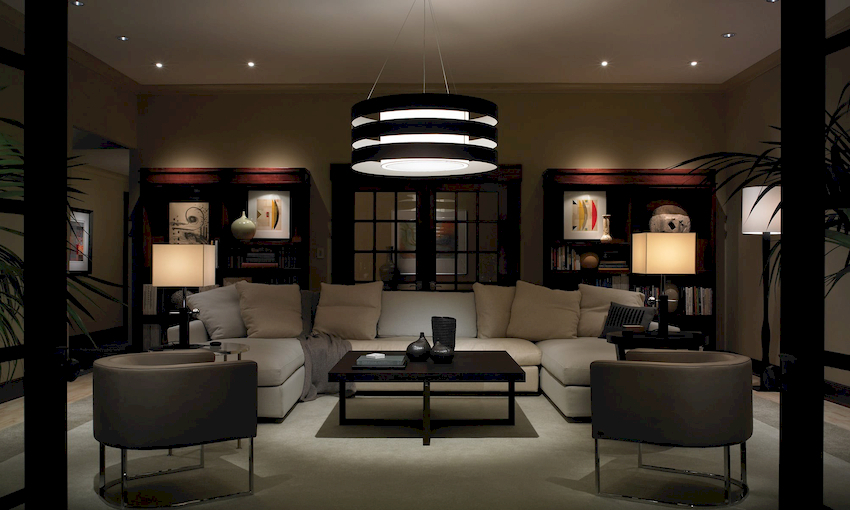 Keamatan dan kaedah pencahayaan dipilih bergantung pada fungsi zon. Candelier siling di ruang tamu tidak harus berada di tengah-tengah bilik. Ini dapat digunakan untuk menerangi kawasan lembut atau tempat di dekat perapian. Lokasi sumber cahaya ditentukan oleh perabot bilik.