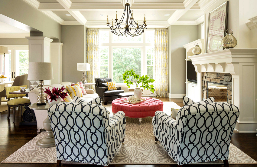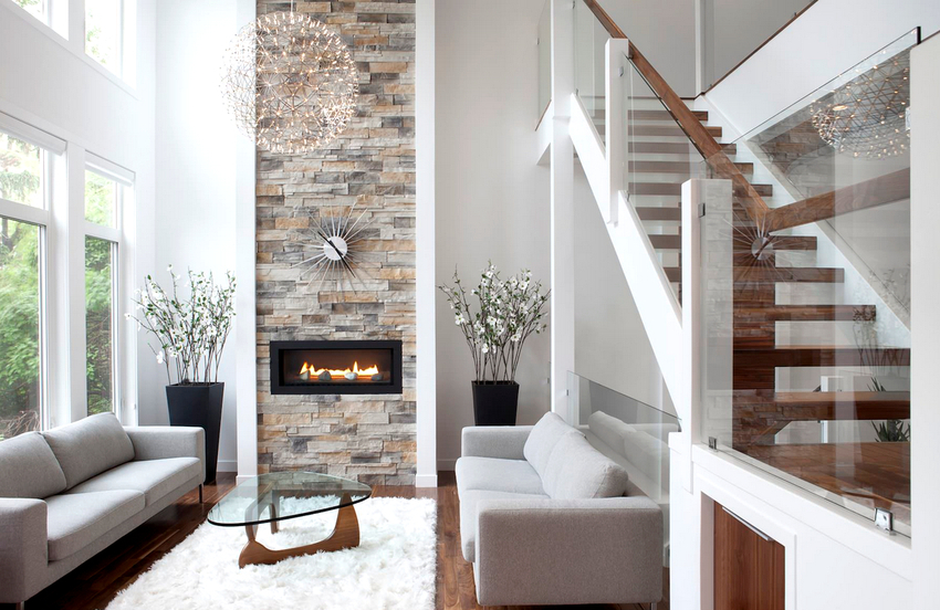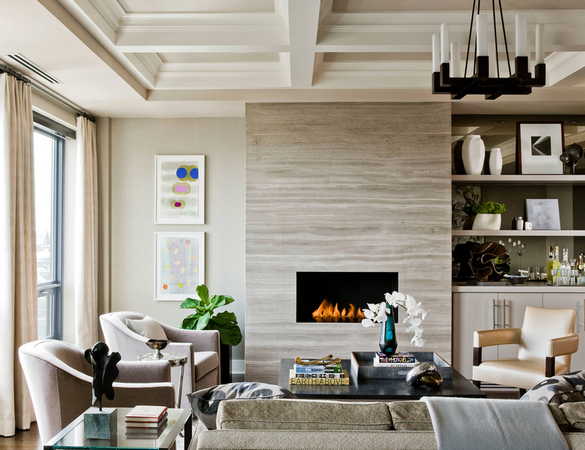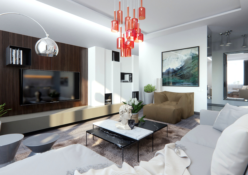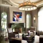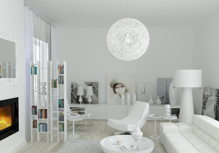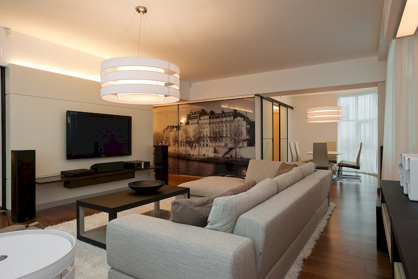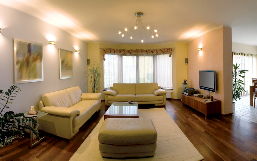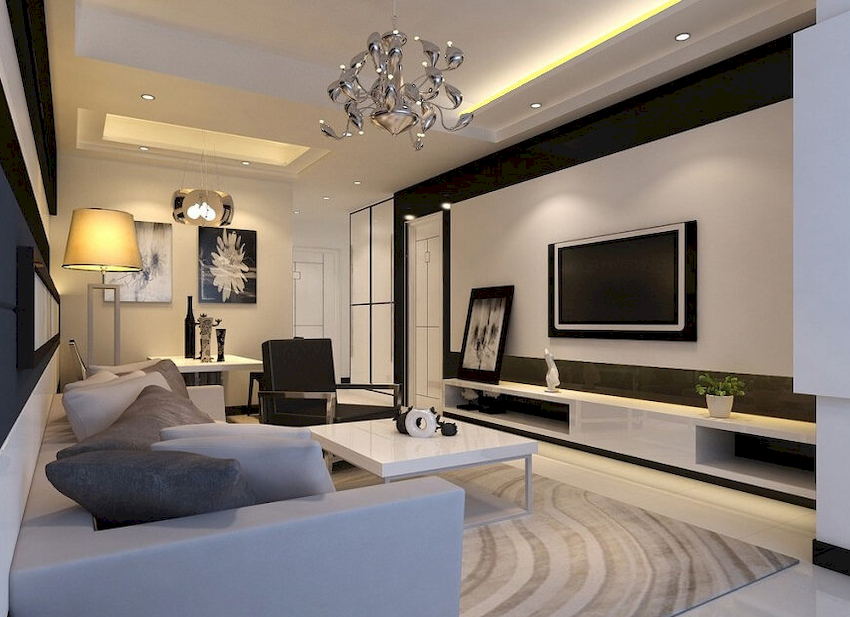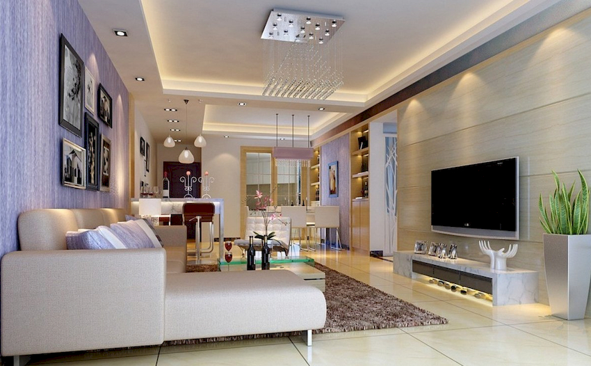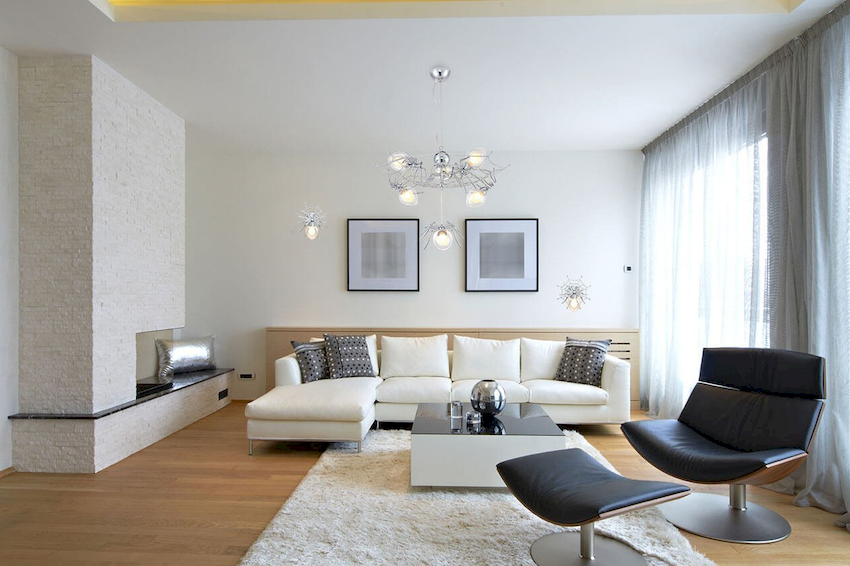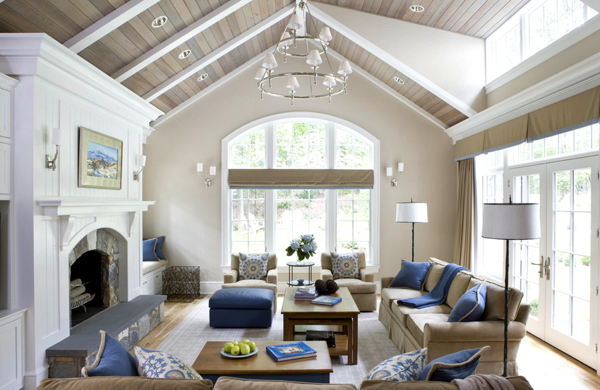 Keamatan dan kaedah pencahayaan dipilih bergantung pada fungsi zon. Candelier siling di ruang tamu tidak harus berada di tengah-tengah bilik. Ini dapat digunakan untuk menerangi kawasan lembut atau tempat di dekat perapian. Lokasi sumber cahaya ditentukan oleh perabot bilik.