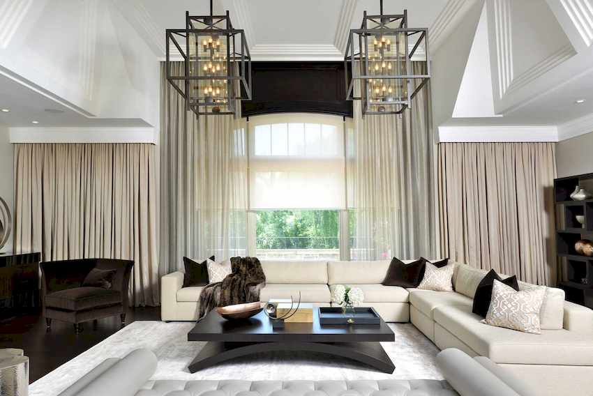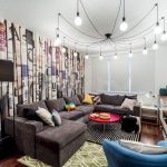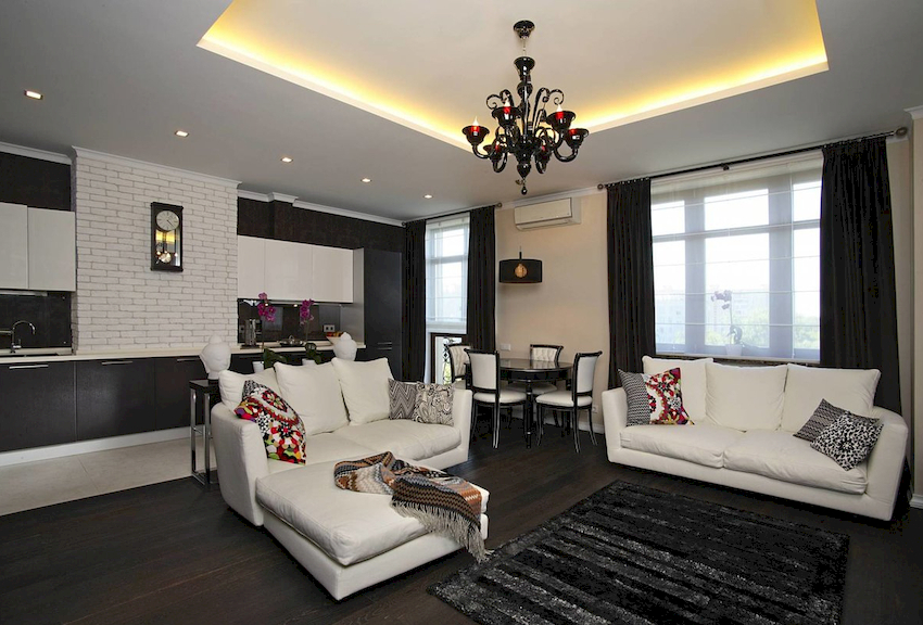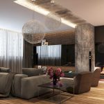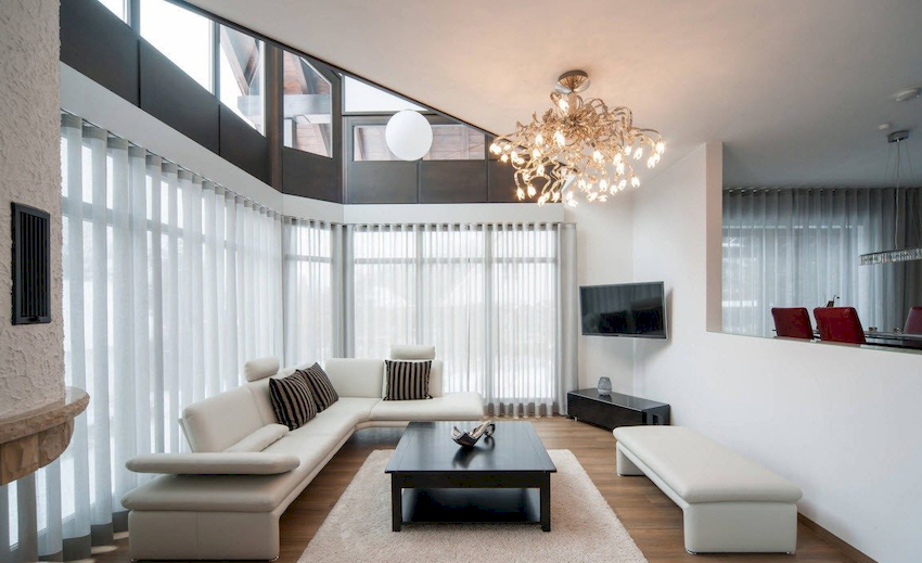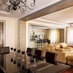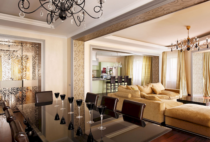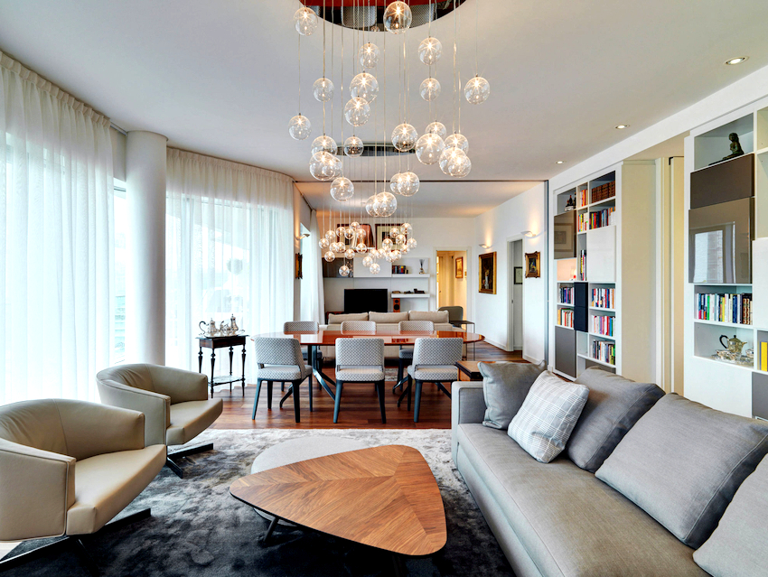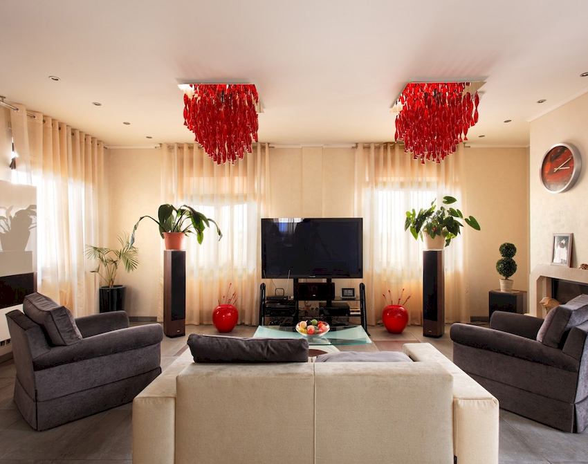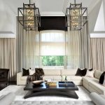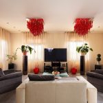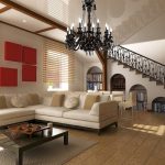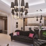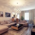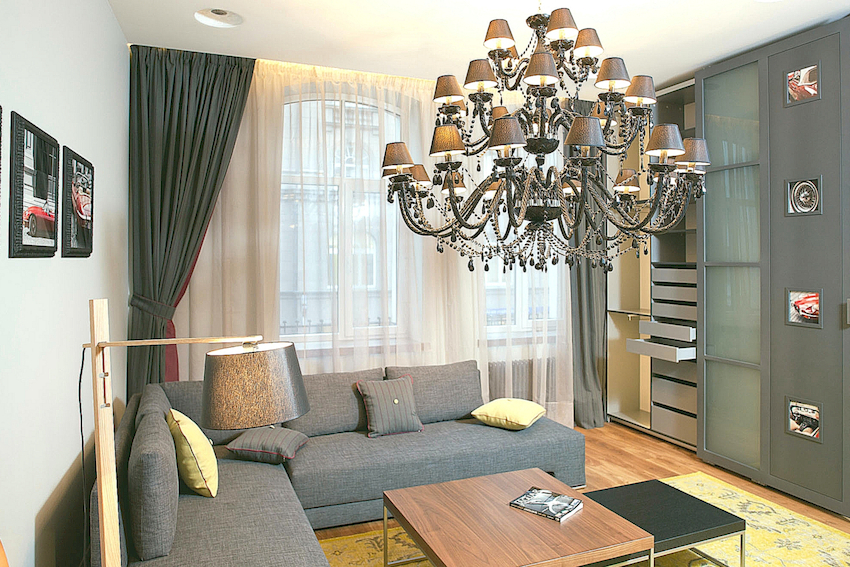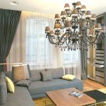 Di ruang tamu yang luas, candelier dapat digunakan untuk pengezonan bilik. Dalam kes ini, anda boleh mengatur pilihan produk yang sama di setiap zon, yang akan memberi pedalaman penampilan yang indah, atau menggabungkan satu elemen dengan sumber cahaya lain dalam bentuk lampu sorot atau sconce dinding, yang akan membentuk kumpulan objek gaya yang sama.