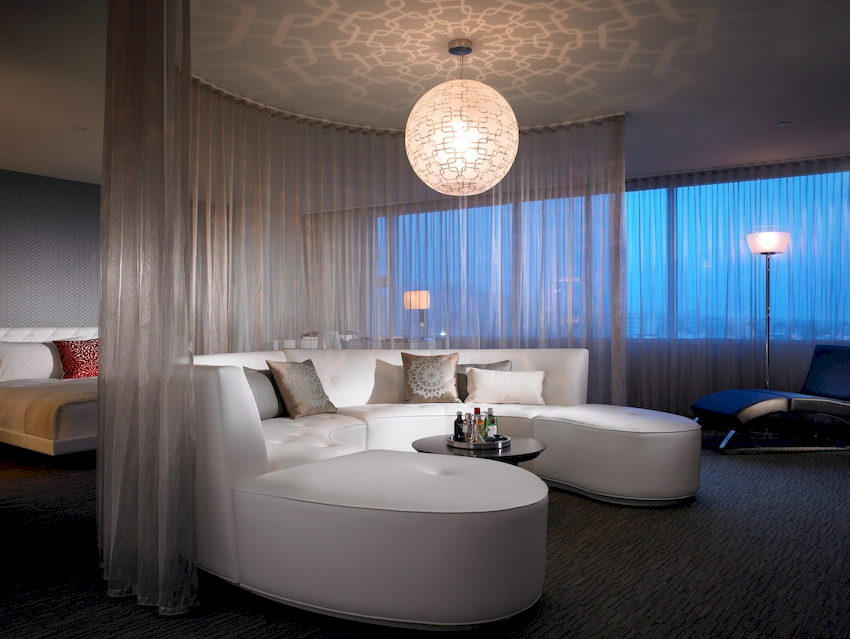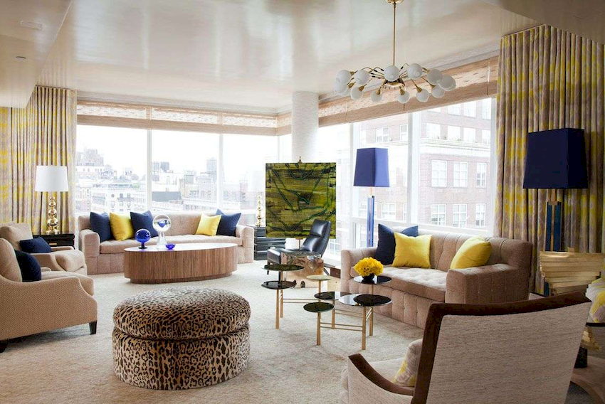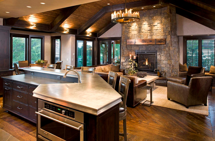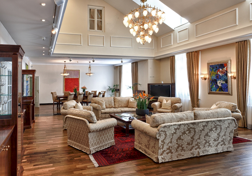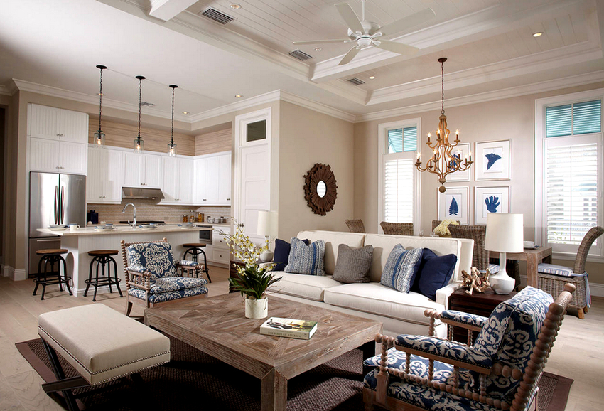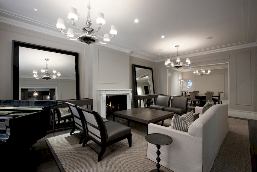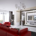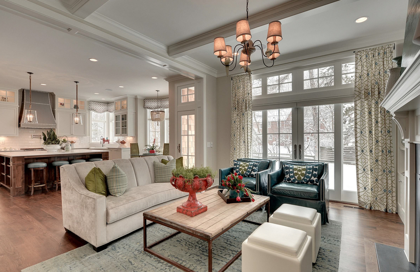 Di ruang tamu yang luas, candelier dapat digunakan untuk pengezonan bilik. Dalam kes ini, anda boleh mengatur pilihan produk yang sama di setiap zon, yang akan memberi pedalaman penampilan yang indah, atau menggabungkan satu elemen dengan sumber cahaya lain dalam bentuk lampu sorot atau sconce dinding, yang akan membentuk kumpulan objek gaya yang sama.