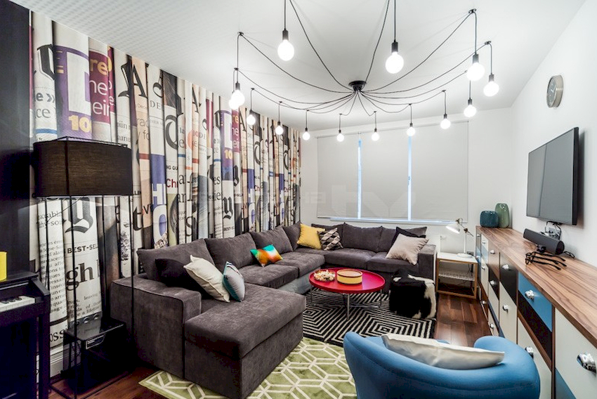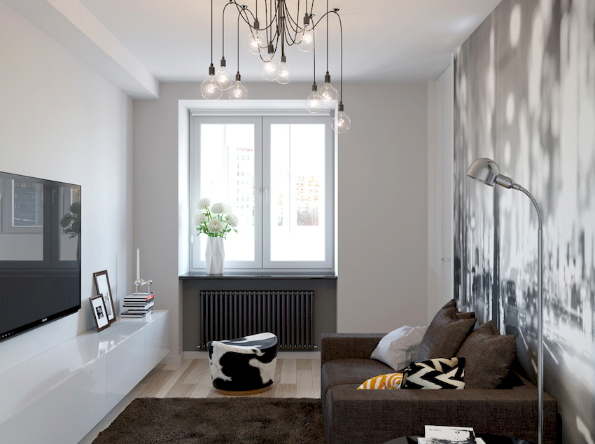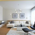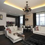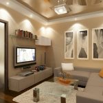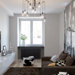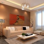 Untuk dewan kecil, anda boleh memilih model lampu yang sama dengan pelbagai warna. Dalam kes ini, candelier dalam naungan cahaya dipasang lebih dekat ke zon lembut, dan produk dalam reka bentuk gelap bergerak menjauh ke hujung bilik. Pilihan lokasi yang berbeza ditunjukkan pada foto candelier di ruang tamu.