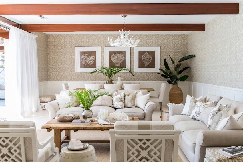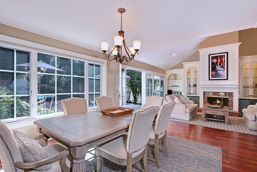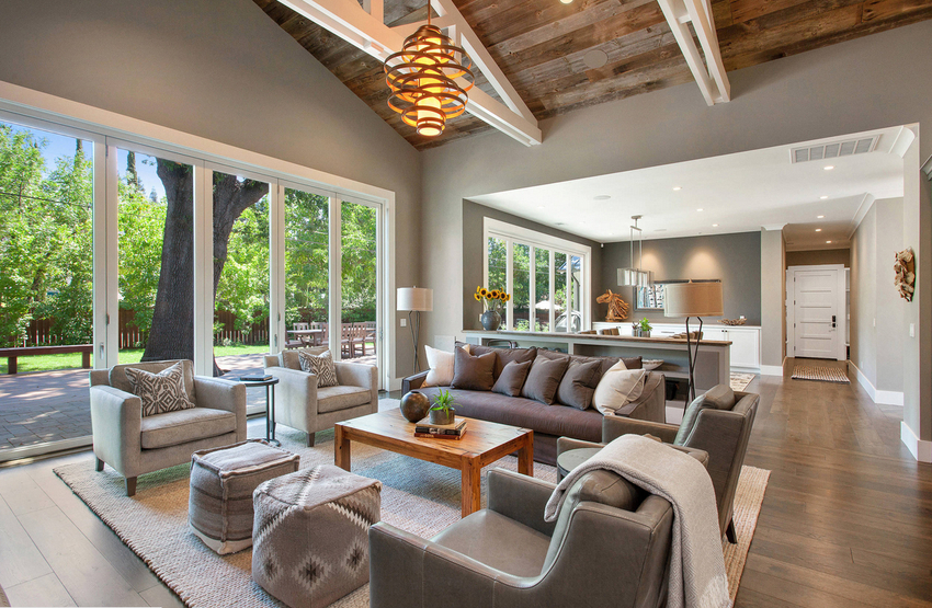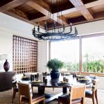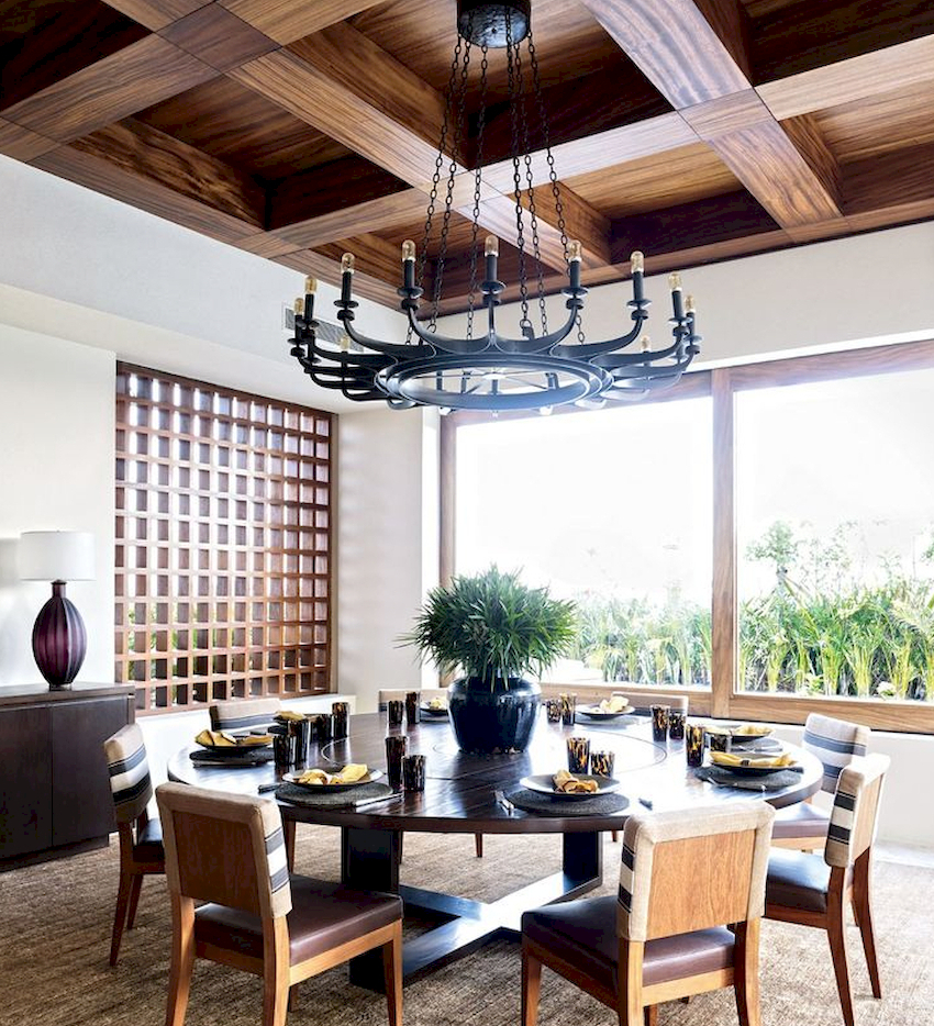 Nasihat berguna! Lampu gantung yang digantung pada batang kelihatan sangat organik di ruang tamu yang digabungkan dengan ruang makan.