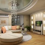 Candelier bulat mampu menambahkan misteri dan misteri ke pedalaman. Foto candelier moden di ruang tamu menekankan kekacauan dan kecanggihan model, yang menjadikannya sesuai untuk kebanyakan gaya dalaman. Candelier cincin akan menjadi hiasan sebenar bilik. Ia boleh merangkak, berlapis-lapis, dan pelbagai panjang. Memilih candelier di ruang tamu dengan siling rendah, anda harus memilih pilihan rata. Reka bentuk ini tidak membebani ruang.