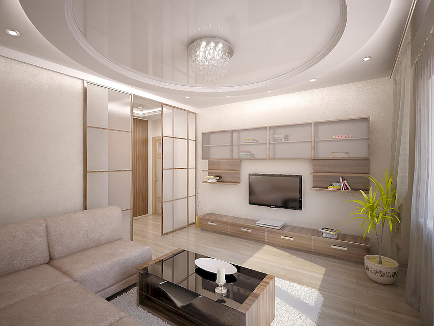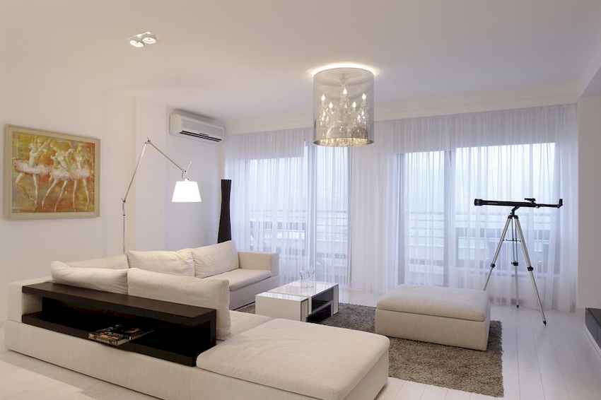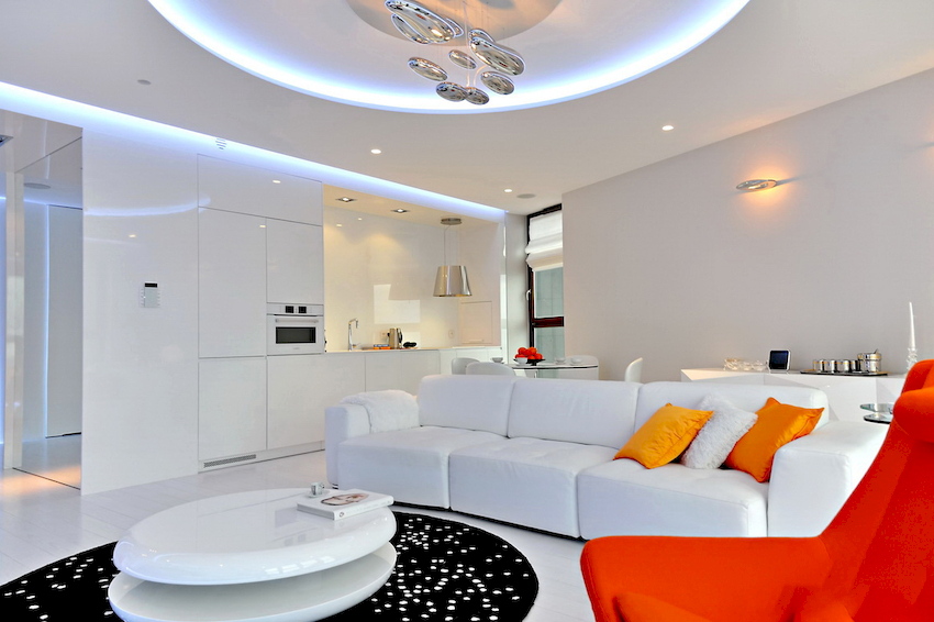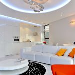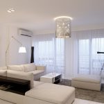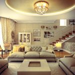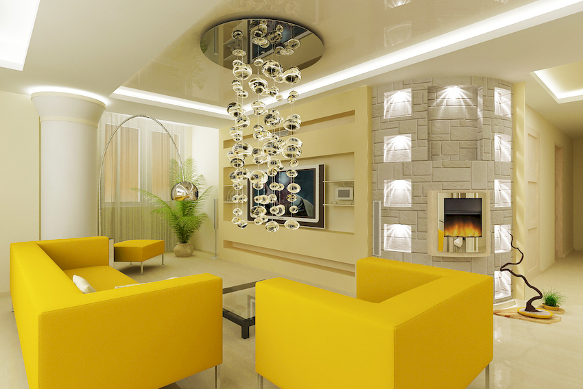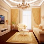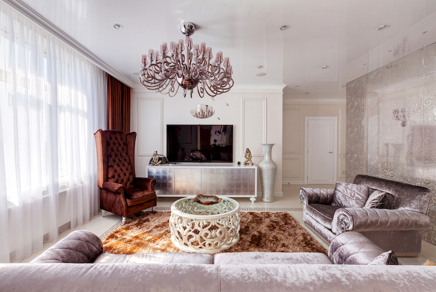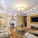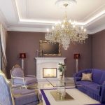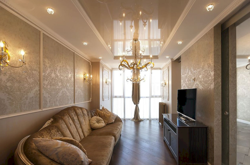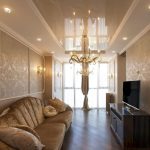 Untuk ruang tamu dengan siling regangan, lebih baik memilih candelier dengan sebilangan besar mentol lemah